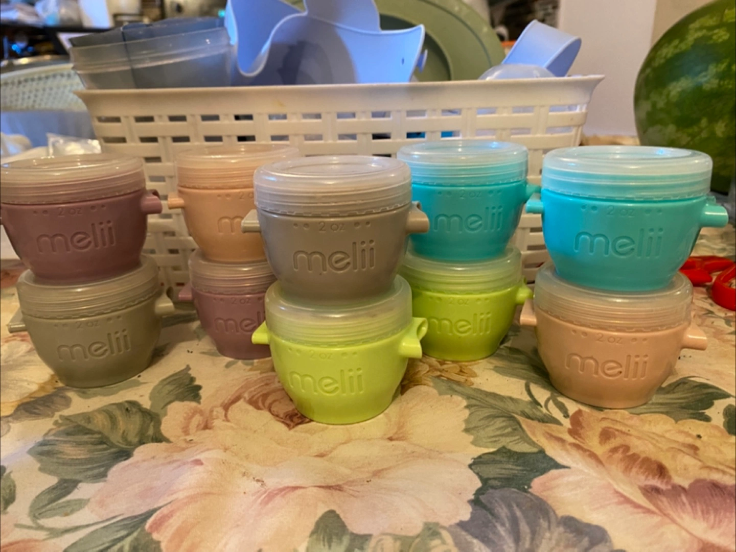Ten reusable 2oz melii food containers. Various pastel colours. Stackable design. Great for meal prep or baby food.