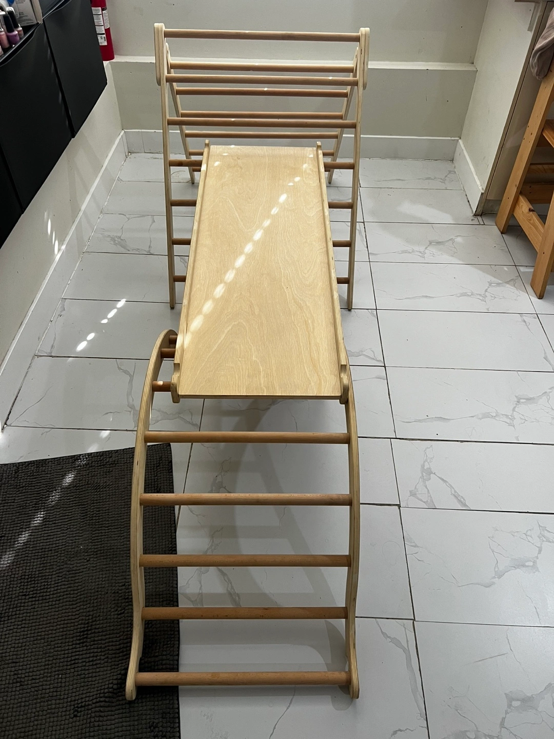Wooden Pikler triangle climber and slide set for kids. Made from natural wood. It's a great indoor active play structure. Perfect for toddlers and young children to develop motor skills!