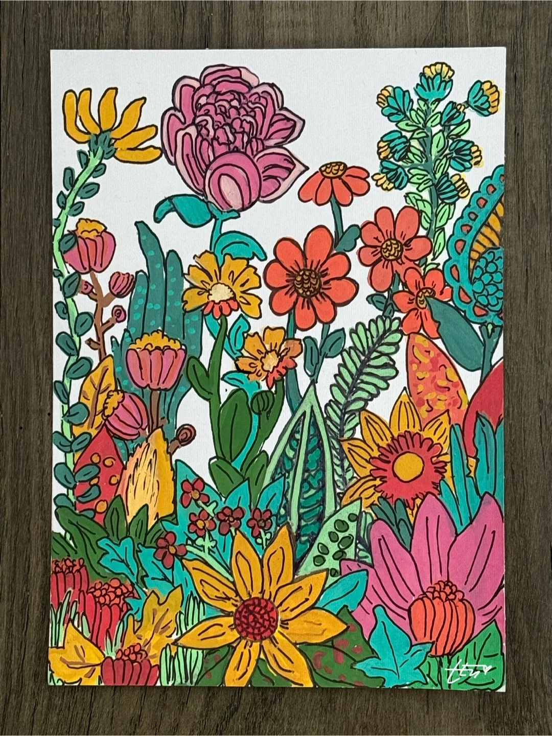 Fill it with Love. This is not a print, hand drawn with love, Acrylic and Ink on a 5”X7” acrylic paper. First of a new series, smaller spin off of my Garden Oasis collection. featuring a lively arrangement of various flowers and foliage. Signed on the back, digital signature as displayed is only for artist’s posting purpose. It's a cheerful piece that's sure to brighten up any room. The vibrant colours make it a nice addition to your home decor.