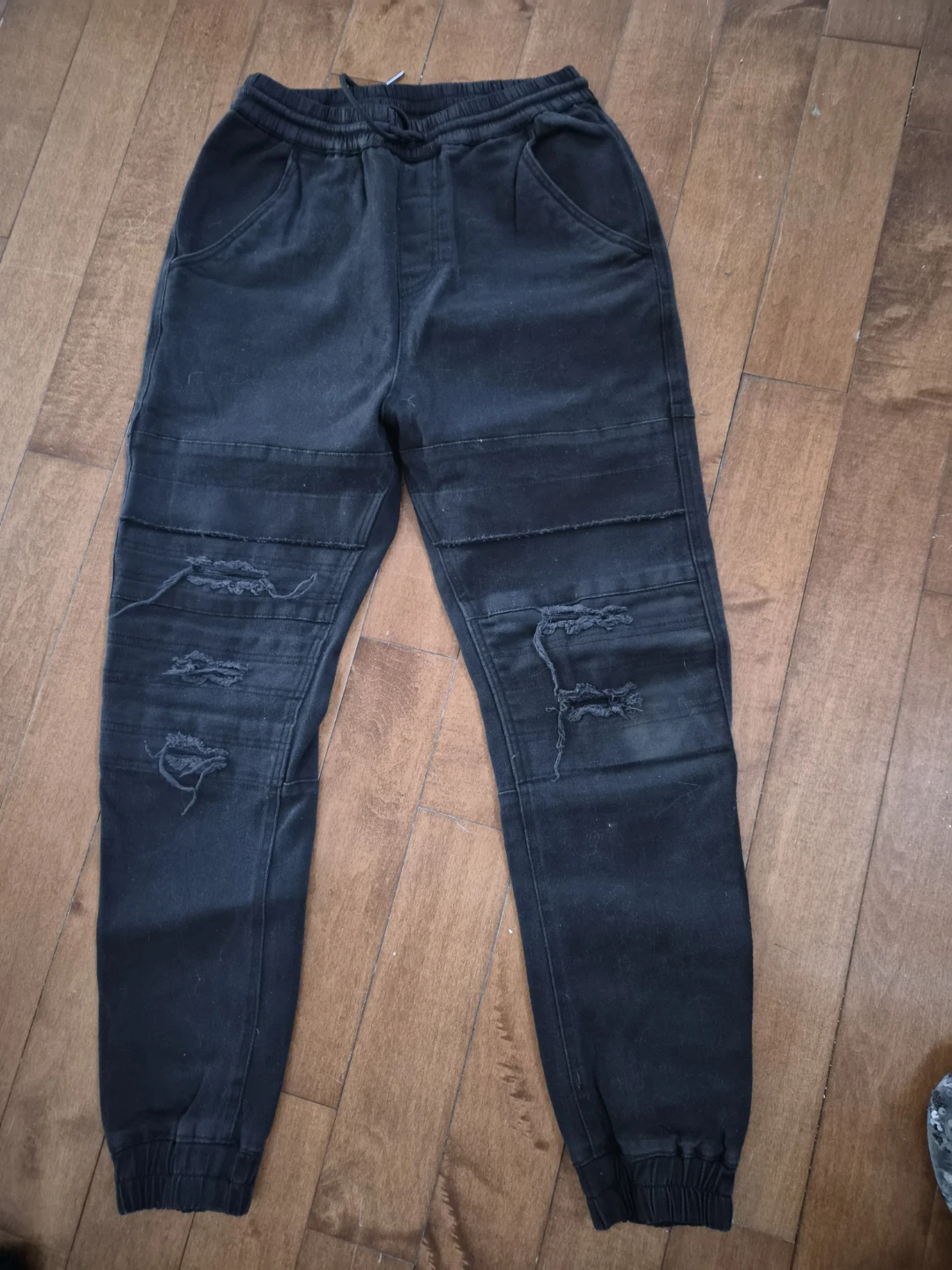 These black jogger pants feature a distressed look with ripped details. They have an elastic waistband with a drawstring and elastic cuffs. Made from a comfortable fabric blend.