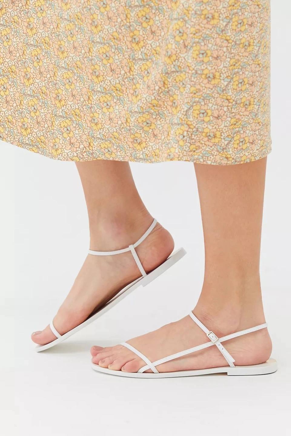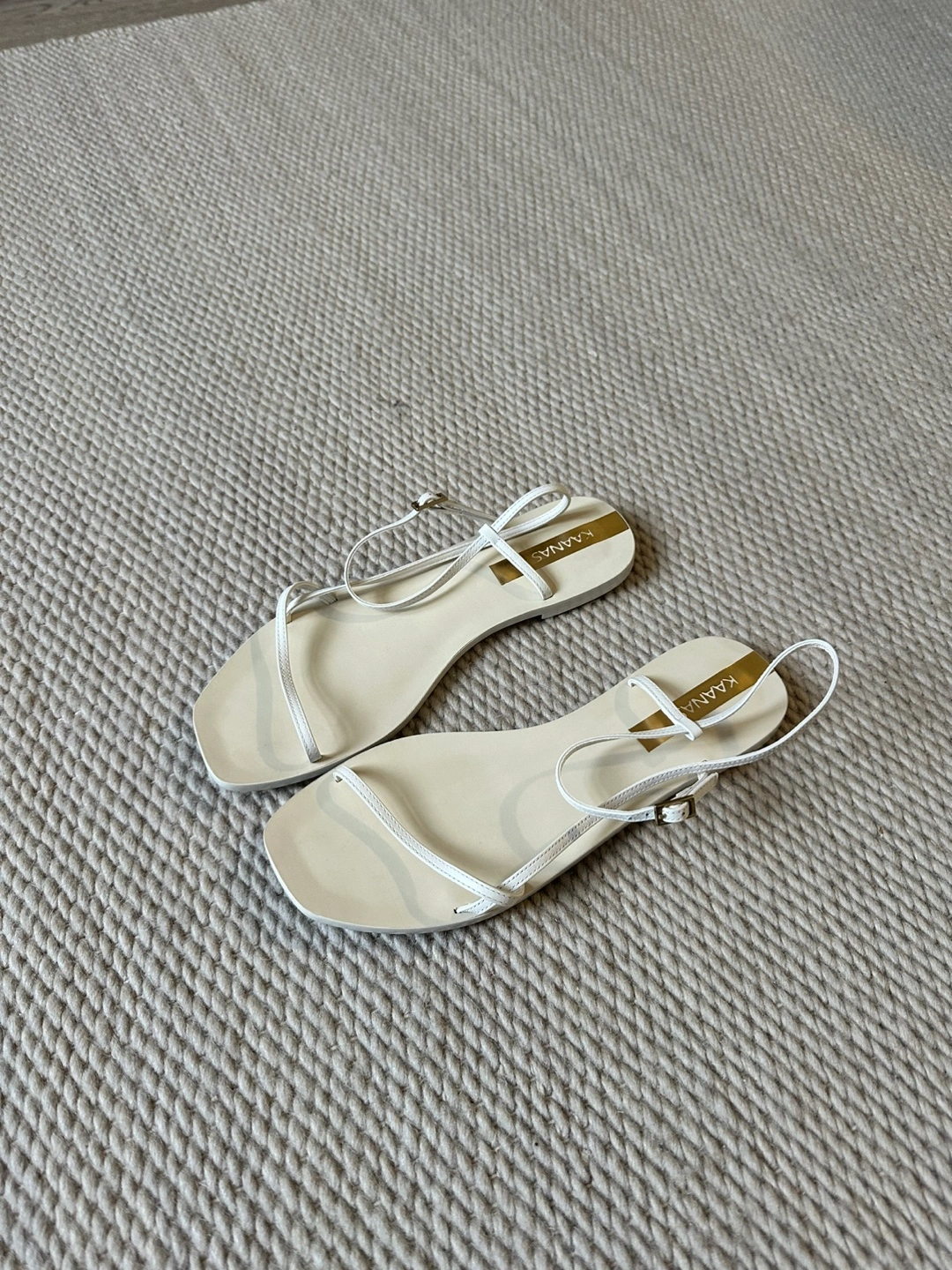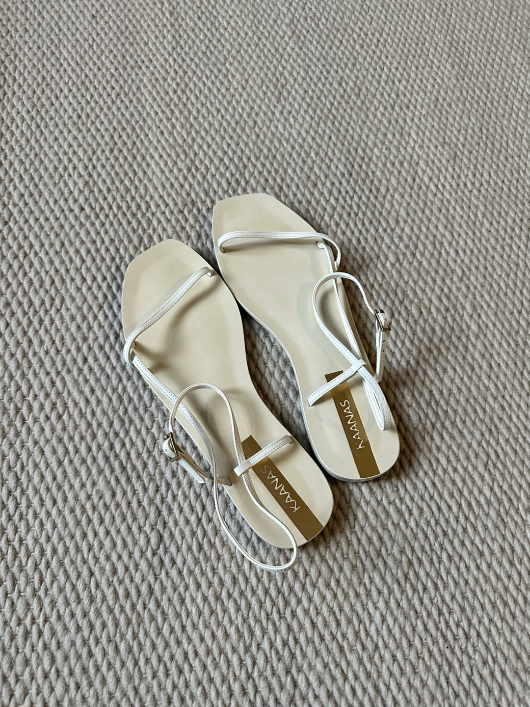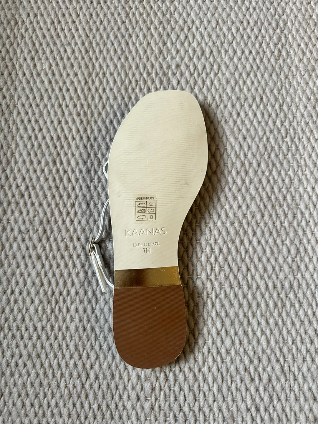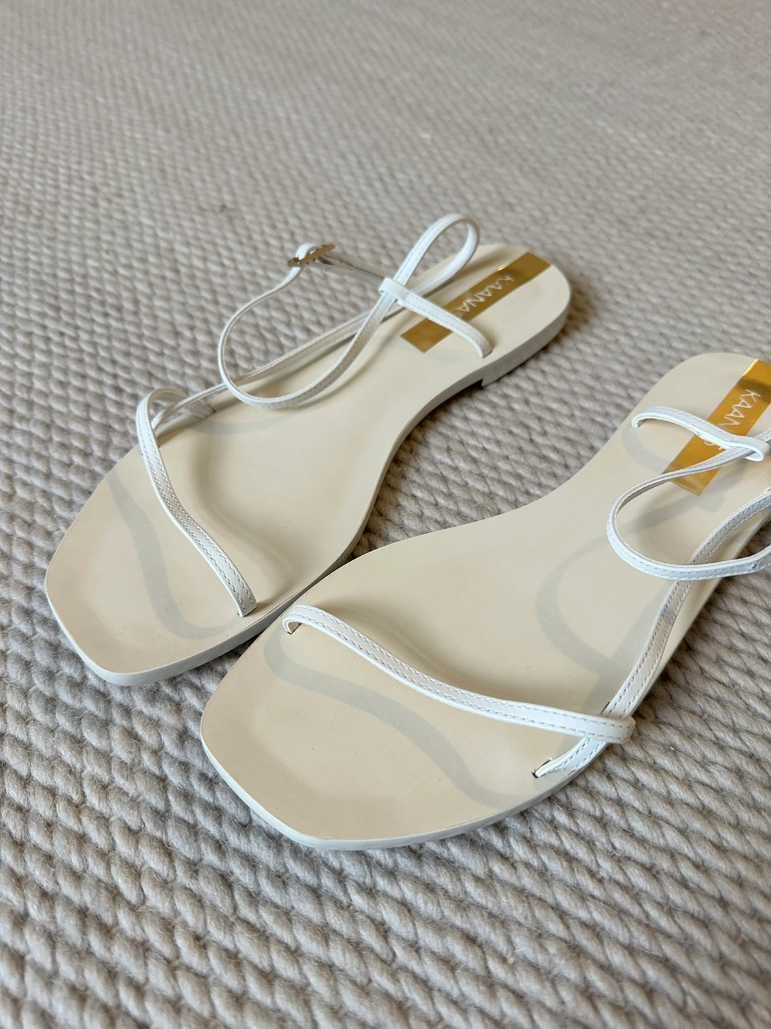 Brand new open-toe minimalist white leather sandals by Kaanas (RRP $175). Comes with original box. Features: Adjustable buckle strap • Made in Brazil ✨From a pet-free & smoke-free home✨ Price negotiable. Cash only. Pick up at Lawrence Allen Mall