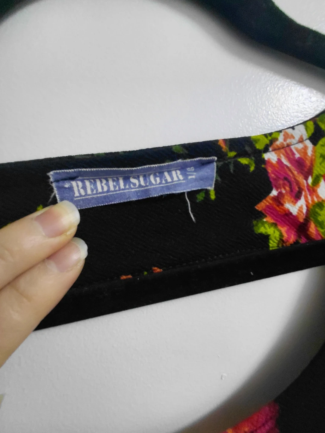 Black dress with a vibrant floral print. It features a cutout detail at the back and cap sleeves. Dress material is soft and stretchy. Size Large