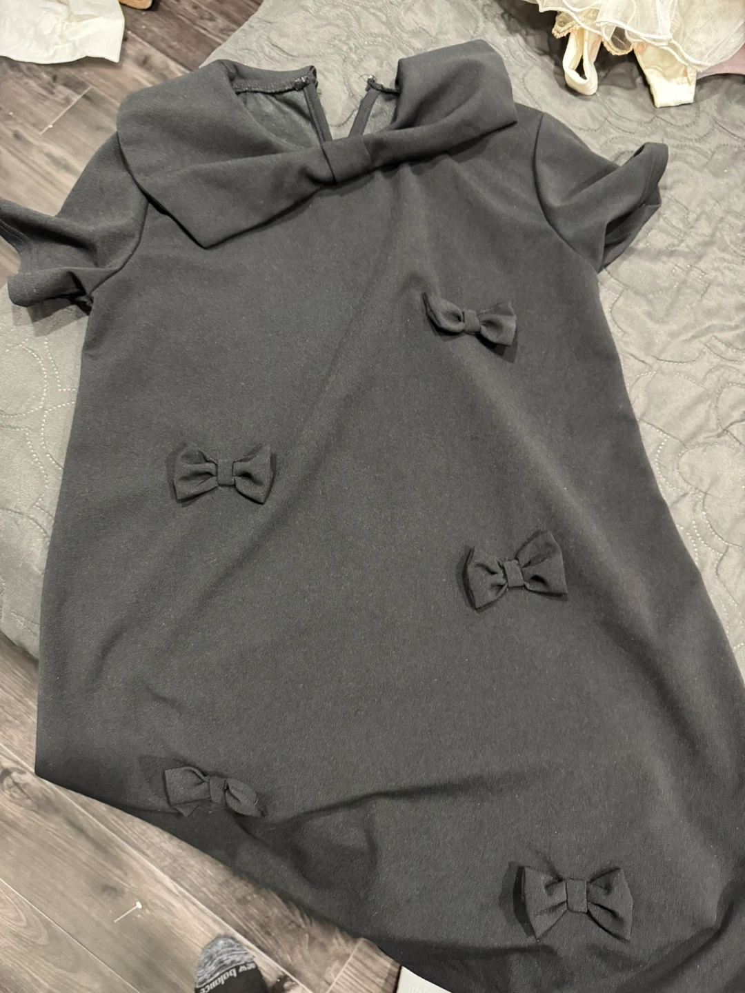 This is a black dress adorned with multiple bow details. It features a Peter Pan collar with a tie. The dress has short sleeves and is made from a soft fabric.