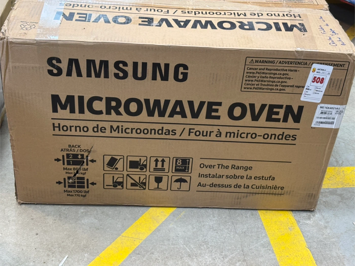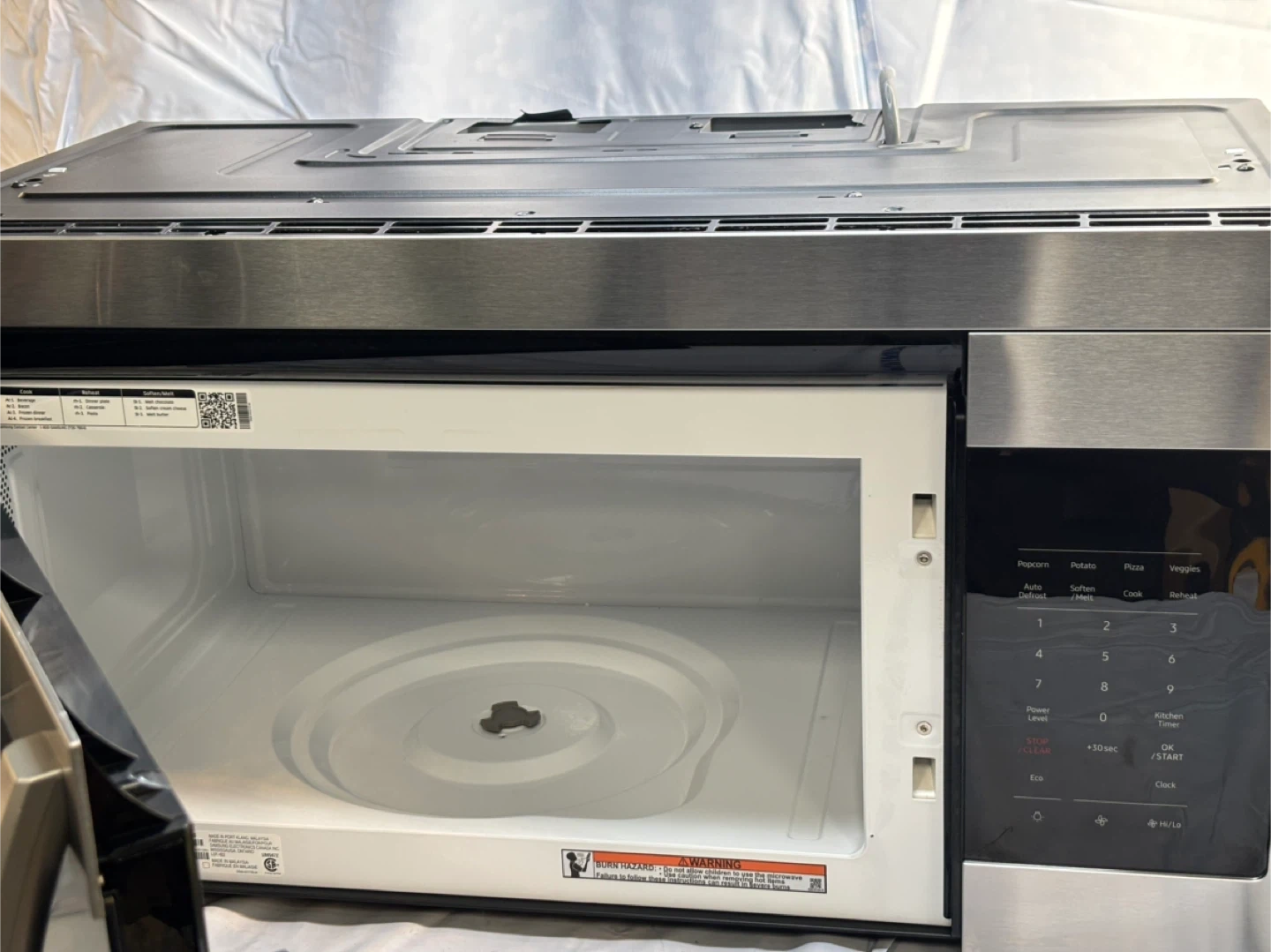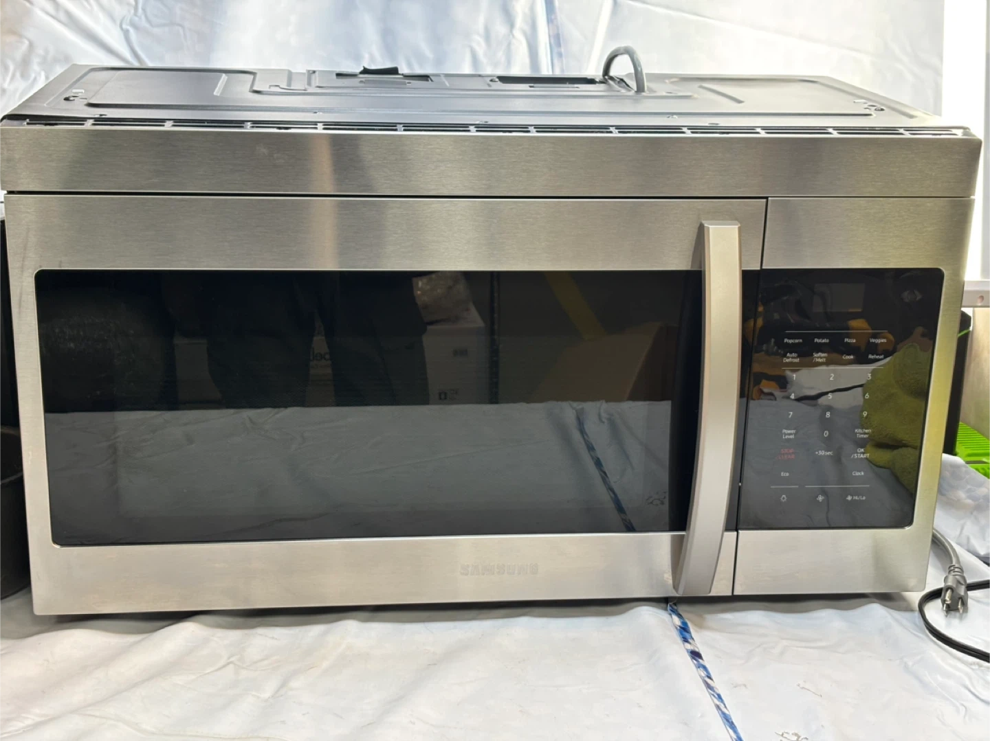 This is a Samsung over-the-range microwave oven. It features a stainless steel finish and a digital control panel. The interior is spacious and includes a turntable.