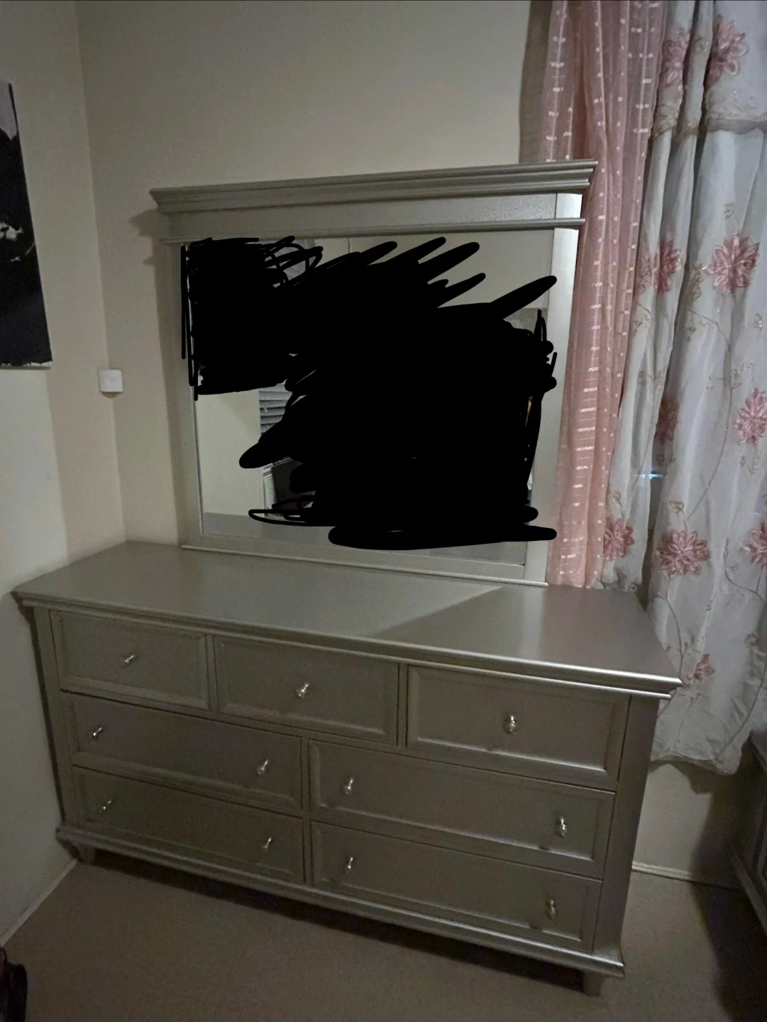 This dresser features a silver finish and seven drawers for storage. The attached mirror offers a convenient vanity space. One minor mark is present on the top surface.