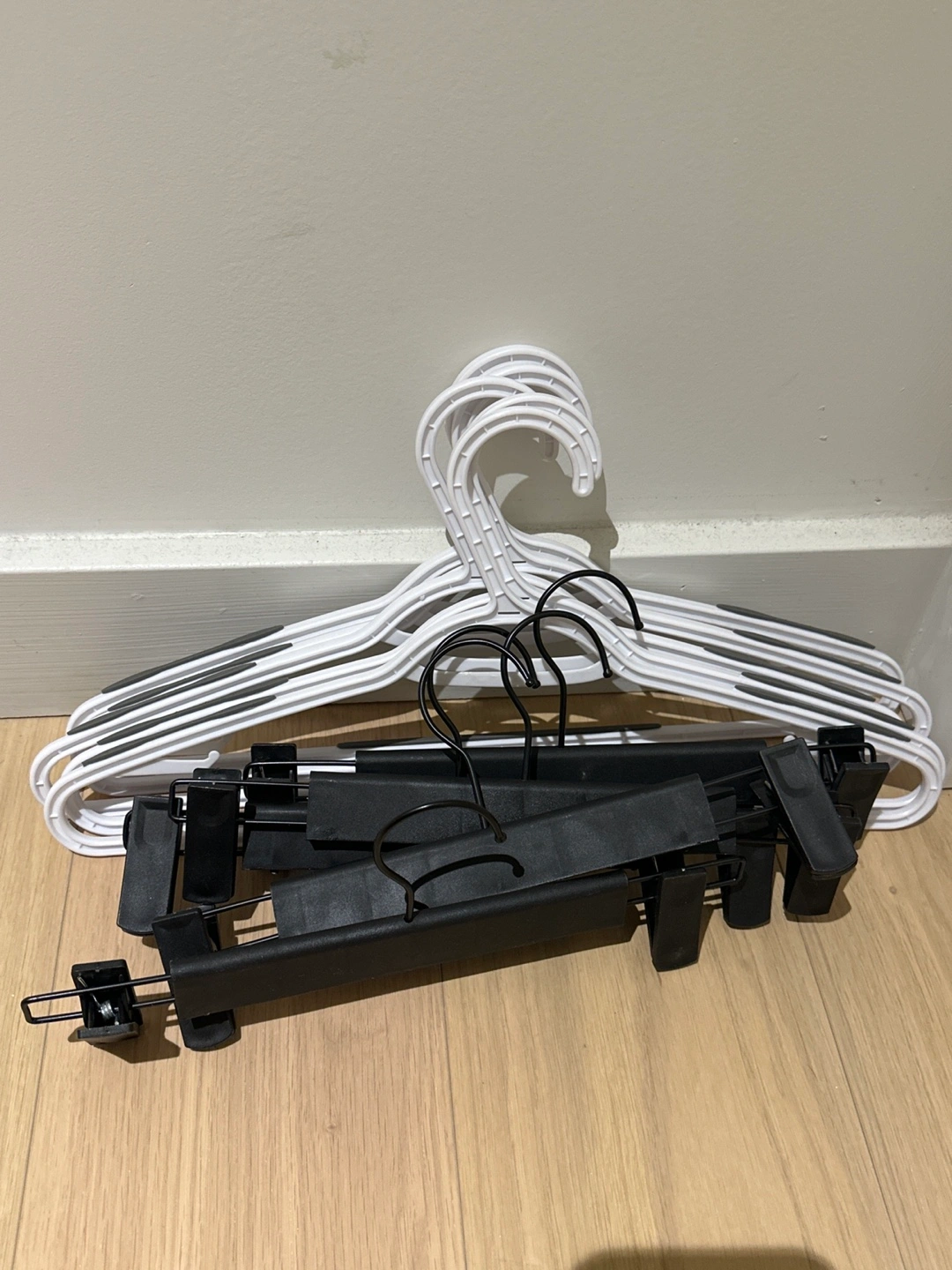 A bundle of plastic hangers, includes both regular and pants hangers. White and black. Great for organizing your closet.
