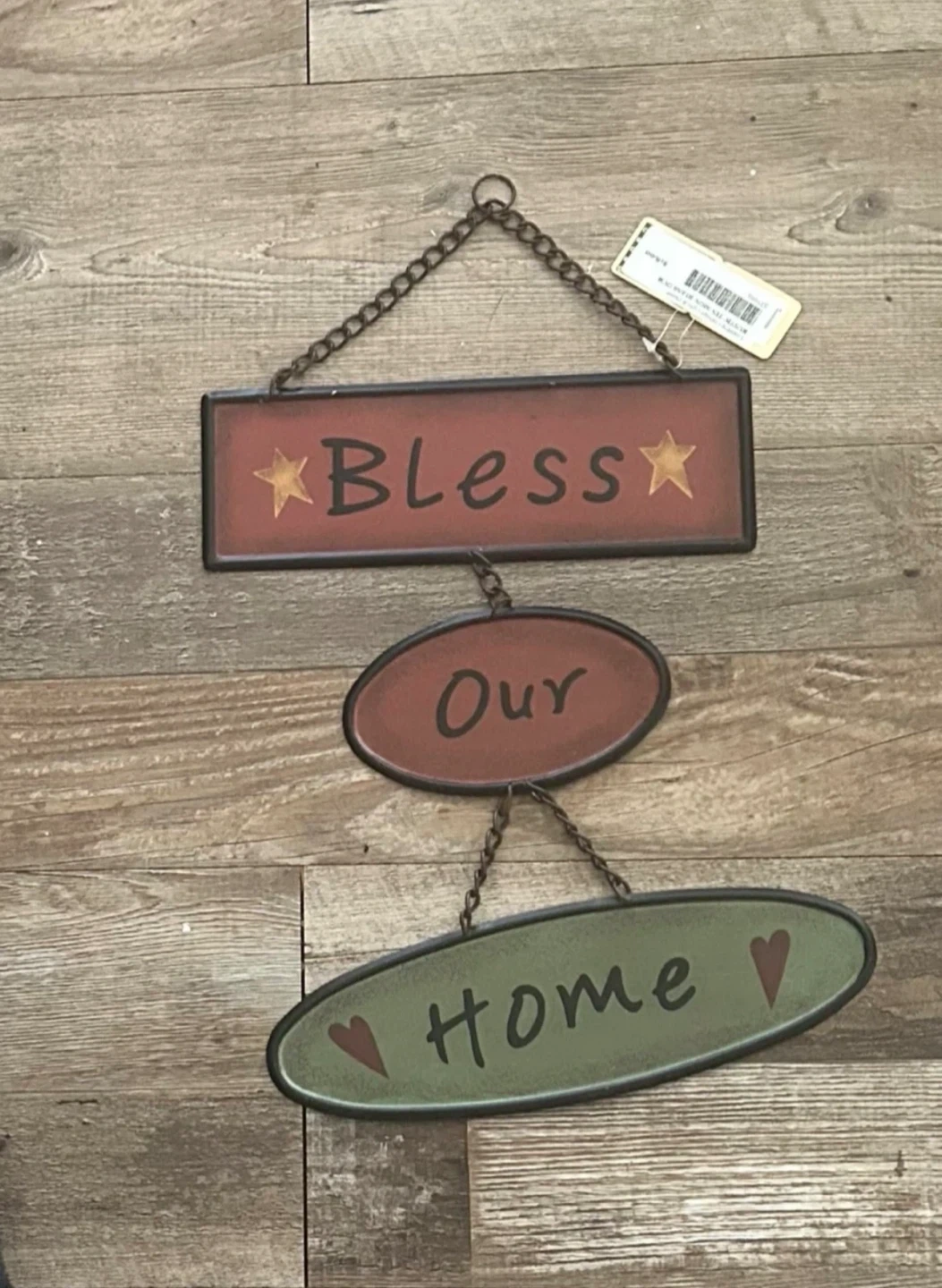 This decorative metal wall hanging sign reads 'Bless Our Home' with stars and hearts. It's connected by a chain and features a rustic, distressed finish. Great for adding a cozy touch to your living space! Brand new still has price tag on