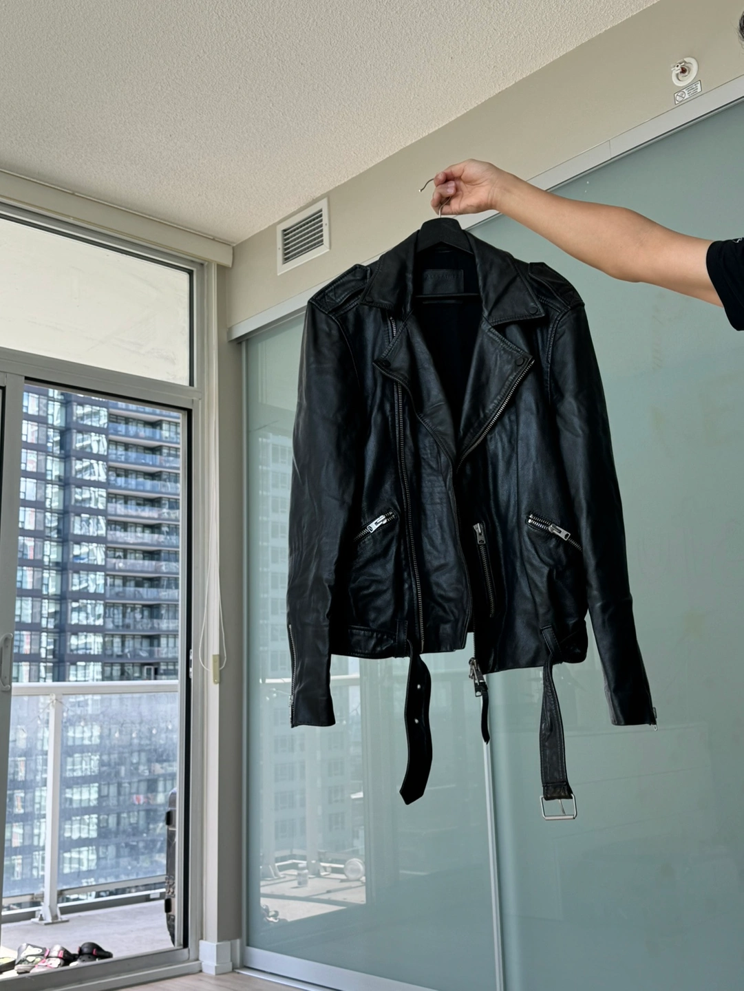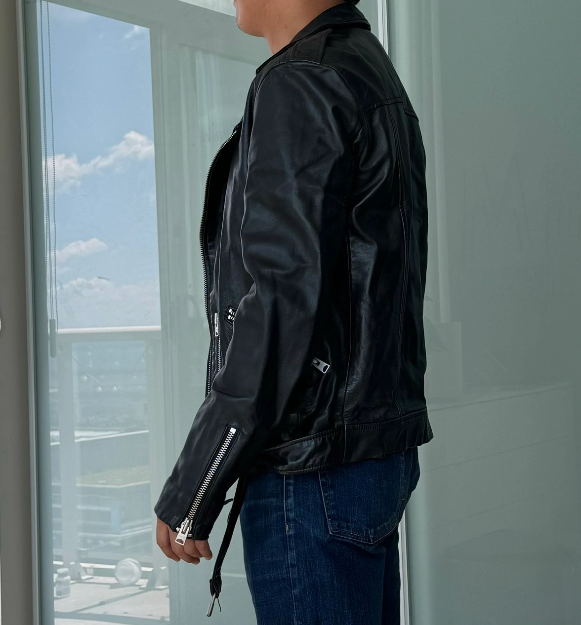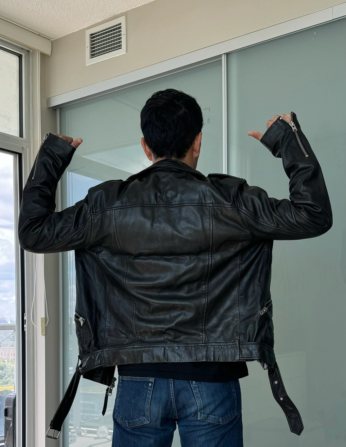 36A black leather jacket with a belt and multiple pockets. It is in good condition. Size is a men's medium. Please message for any questions or concerns. Thank you. Material: 100% sheep leather