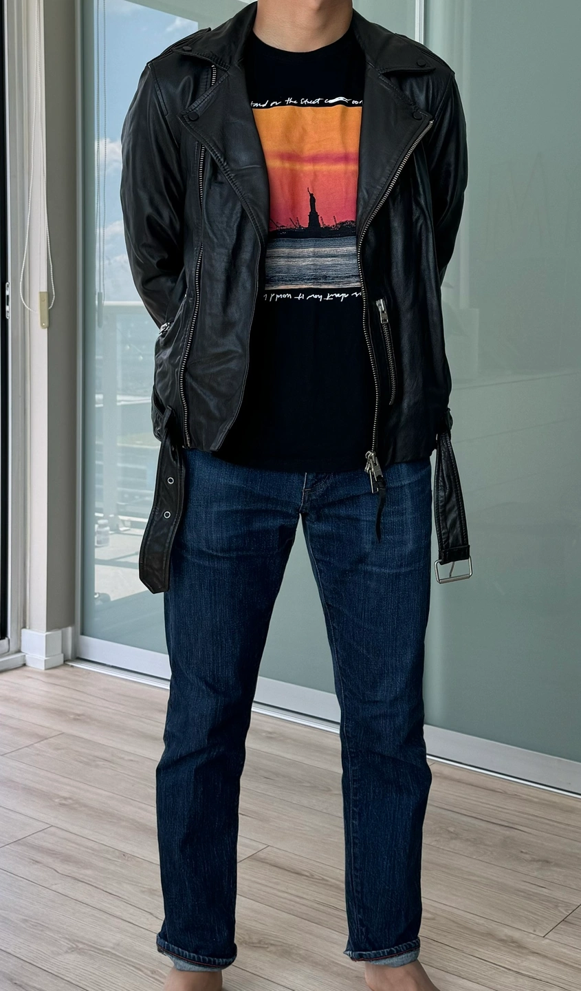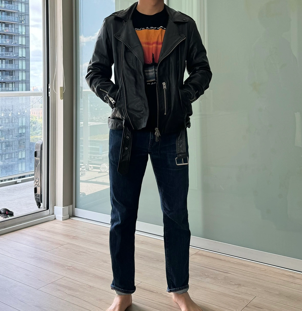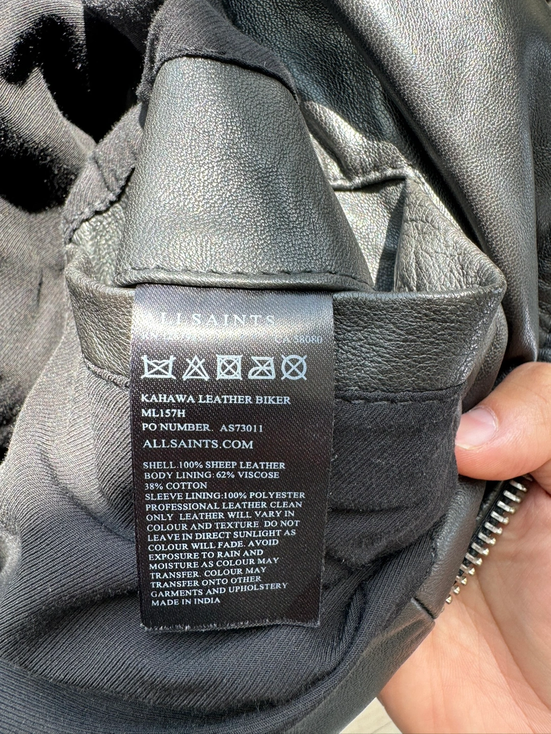 36A black leather jacket with a belt and multiple pockets. It is in good condition. Size is a men's medium. Please message for any questions or concerns. Thank you. Material: 100% sheep leather