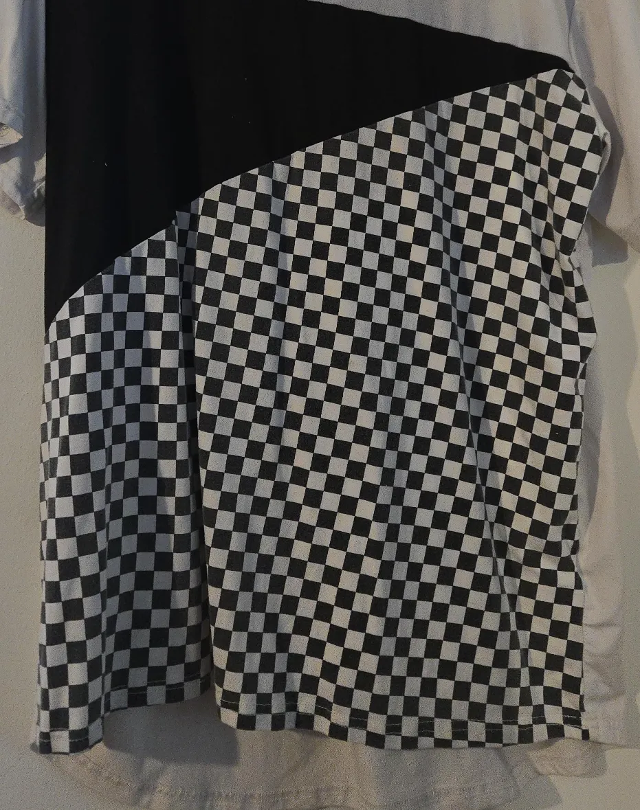 This t-shirt features a bold checkerboard pattern. It has a black panel across the top left. Material appears to be cotton blend. Great for casual wear!
