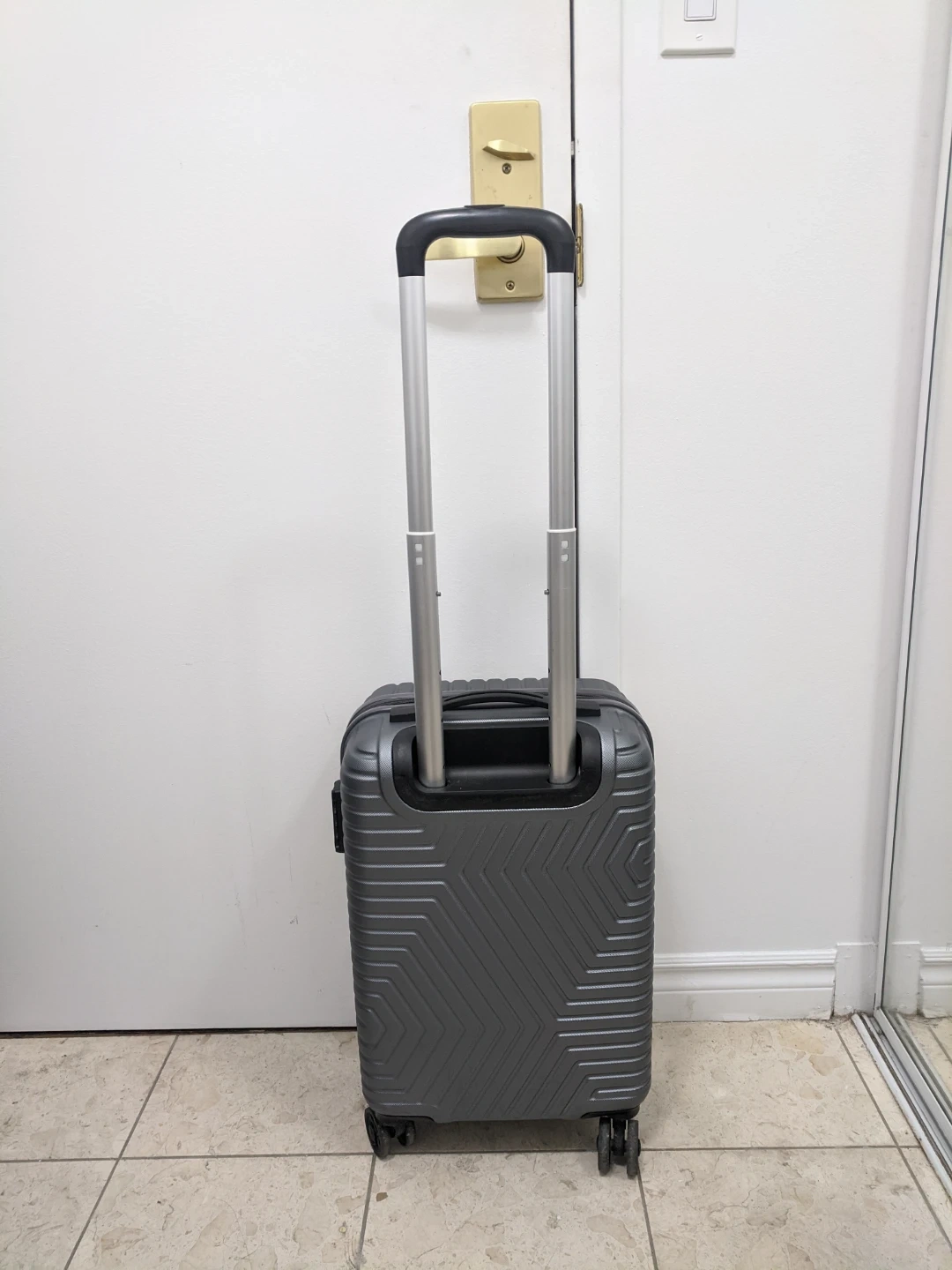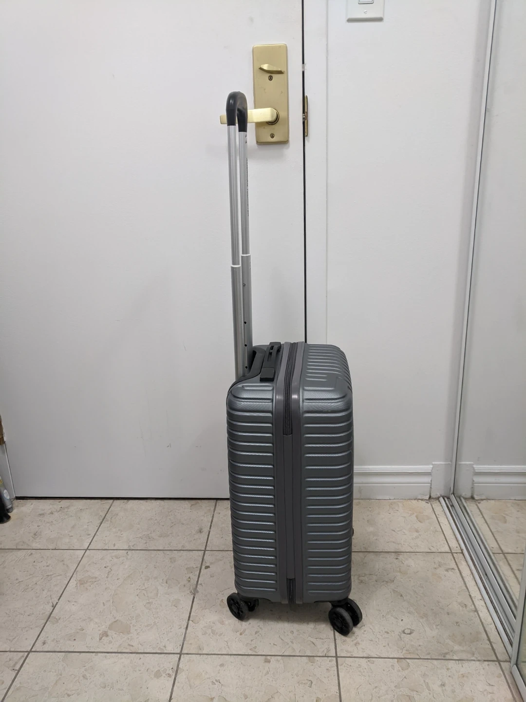 This is an American Tourister hardside spinner suitcase. It's a grey colour and has four wheels for easy manoeuvring. The interior features zippered compartments for organized packing.13.3"x9.5"x20.5" . Pick up at 195 Merton Street Toronto or pick up at Subway station Davisivill. And I can deliver it to your house but you need to pay me another $3. Thanks.