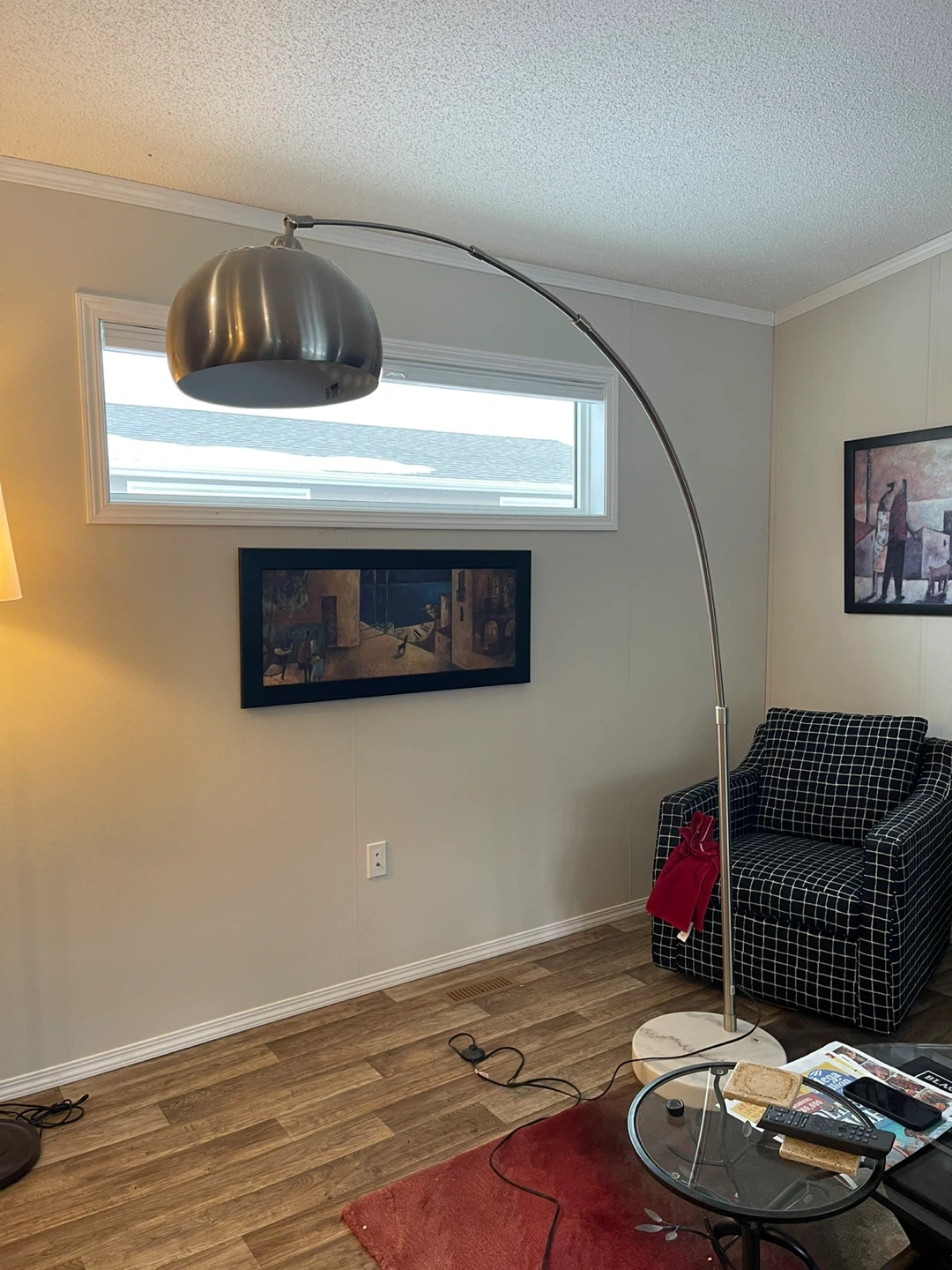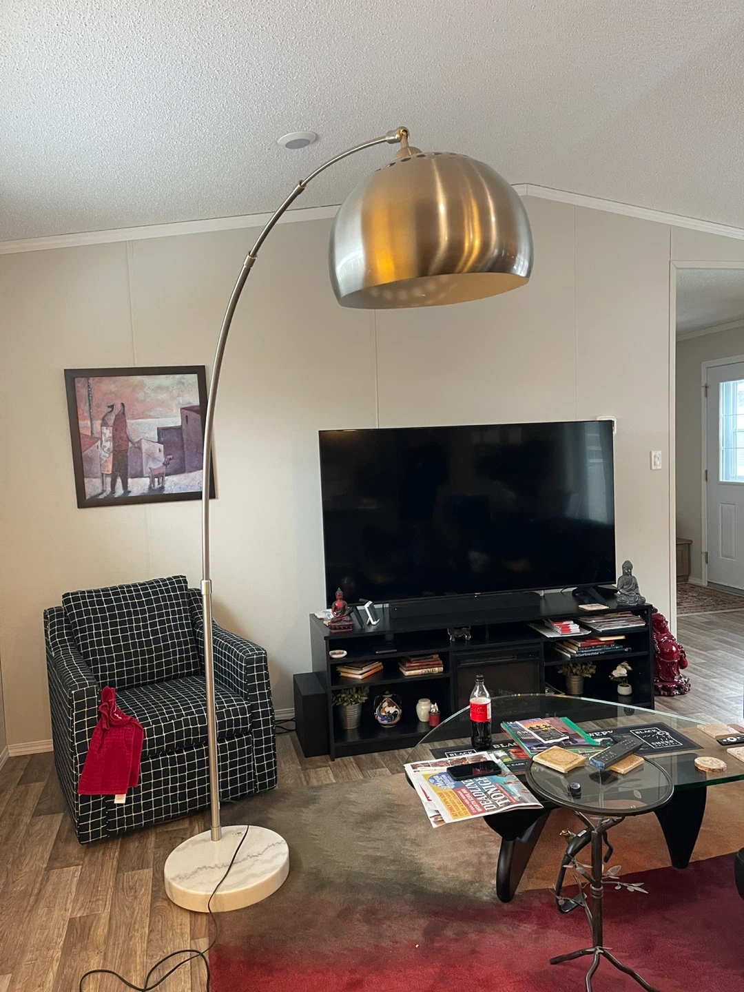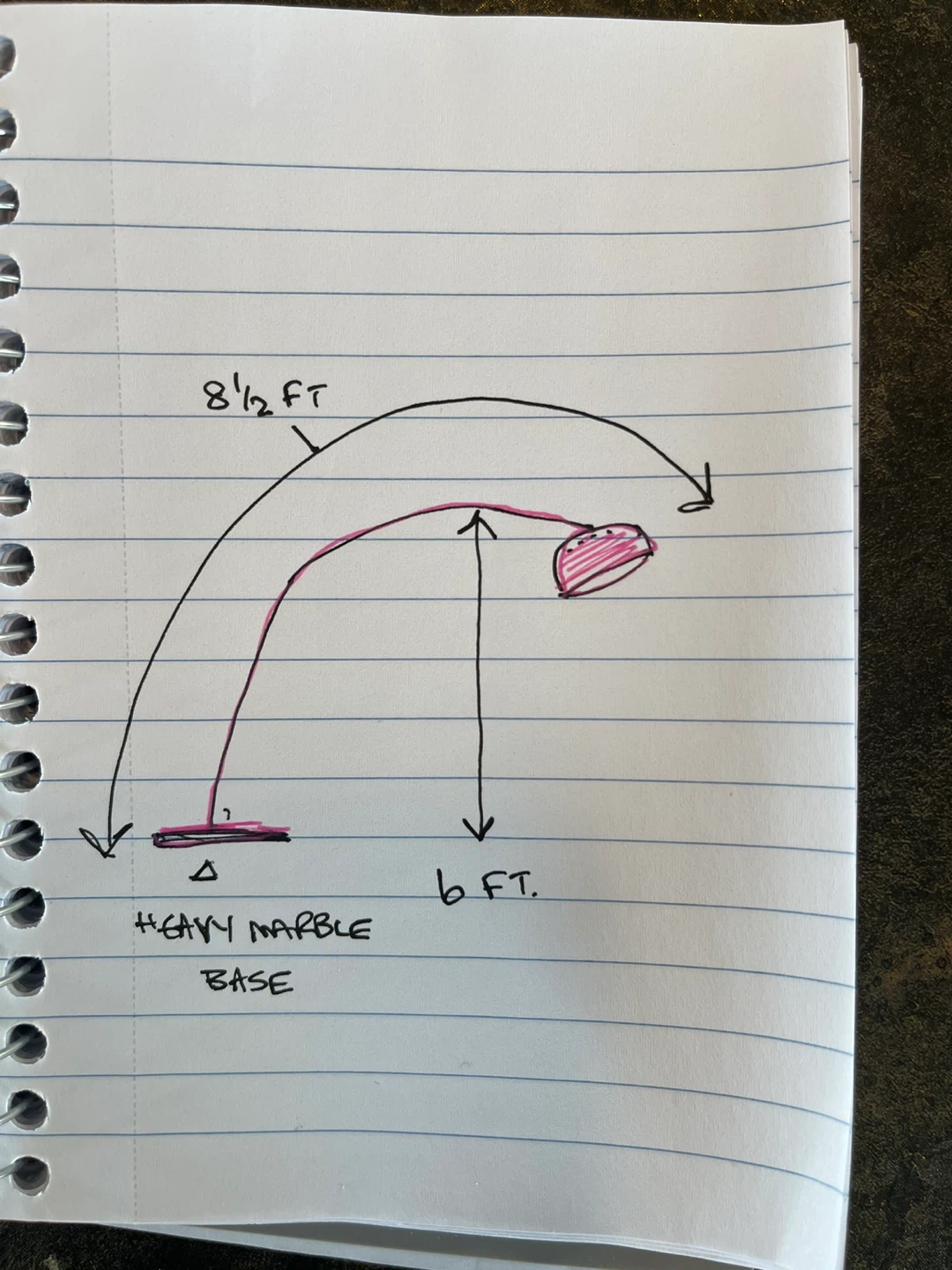 A brushed nickel arc floor lamp with a large dome shade. It has a heavy marble base for stability and extends 8 1/2 ft. The lamp reaches 6 ft. high. It's a stylish lighting solution for any room!