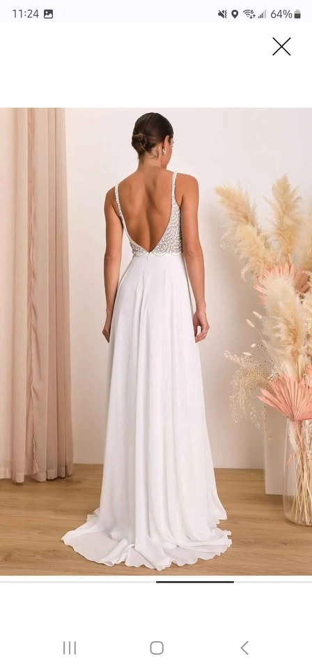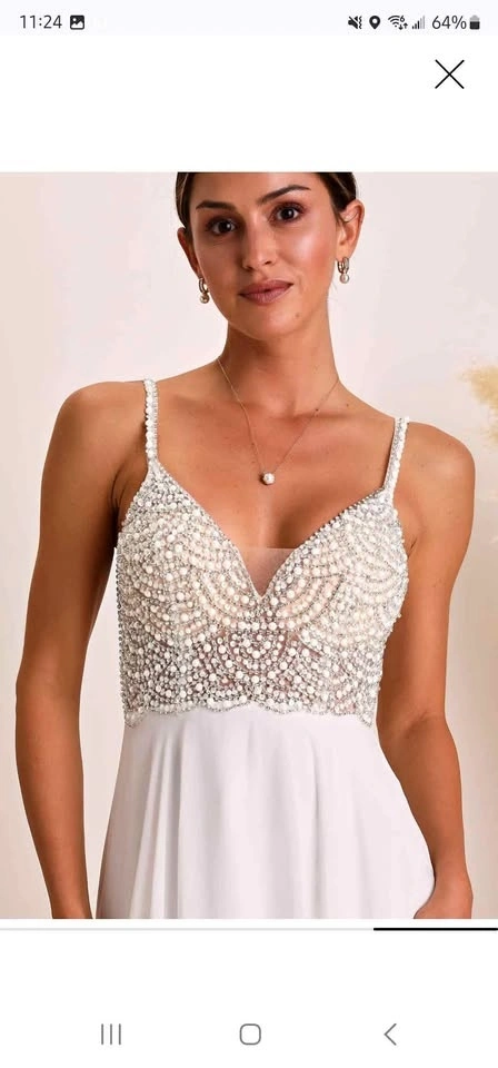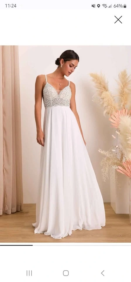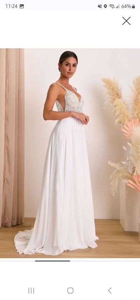 Beautiful Lulu’s white wedding dress featuring an elegant beaded pearl bodice and a flowing floor-length skirt. This gown has a flattering V-neckline and an open back, creating a modern, romantic silhouette that photographs beautifully. Worn once and in excellent condition — perfect for a bride looking for a stunning dress without paying boutique prices. Details: Brand: Lulu’s, Size: 0, Color: White, Beaded pearl bodice, Open / backless design, Floor-length maxi skirt, Built-in cups (can be removed), Lightweight and comfortable. Perfect for a wedding, elopement, engagement shoot, destination ceremony, or rehearsal dinner. Pickup in Scarborough (M1C). Try-on welcome for serious buyers.