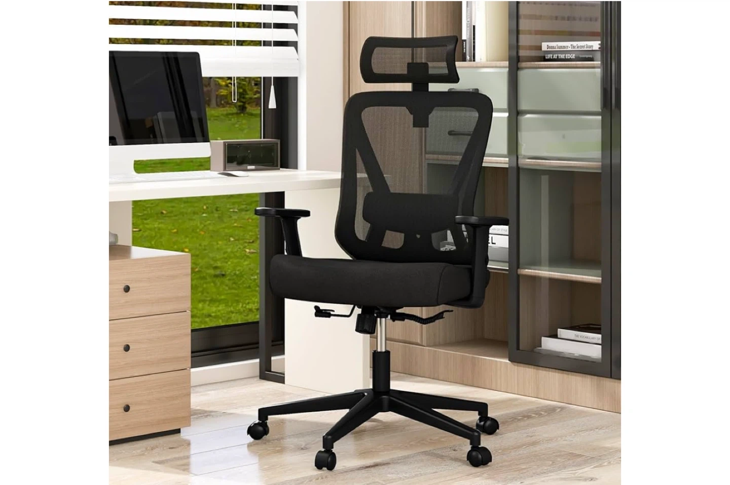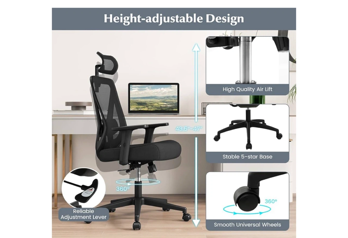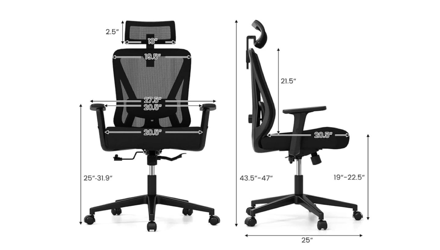 Looking to upgrade your home office? This black ergonomic office chair could be just what you need! It features a height-adjustable design, a stable 5-star base, smooth universal wheels, and a reliable adjustment lever. The chair's height can be adjusted from 43.5" to 47", and the seat depth is around 20.5".