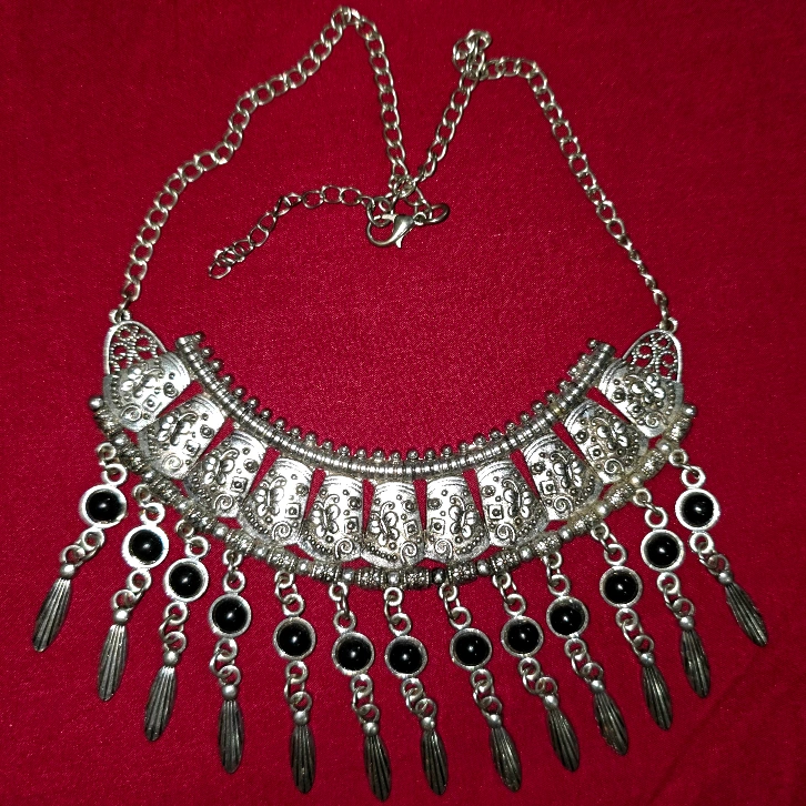 Standout silver statement necklace featuring decorative details, black beads, and chain closure. Truly one-of-a-kind, perfect for adding bohemian flair to any look.