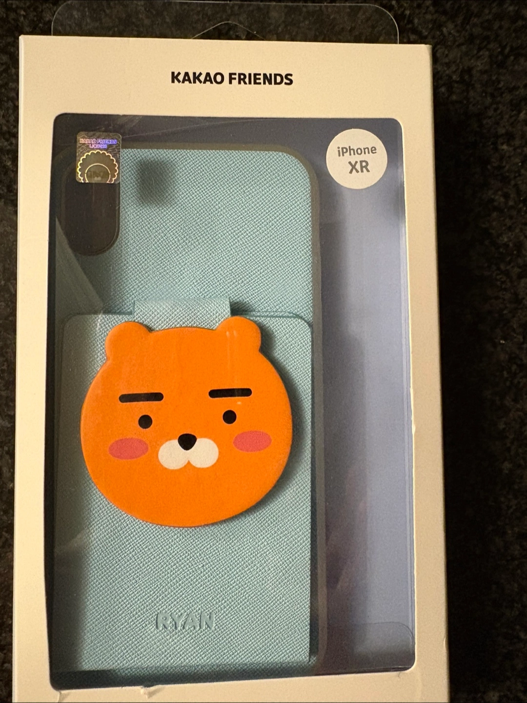 New phone case and stand. Light blue case with orange Ryan character. Designed for iPhone XR.
