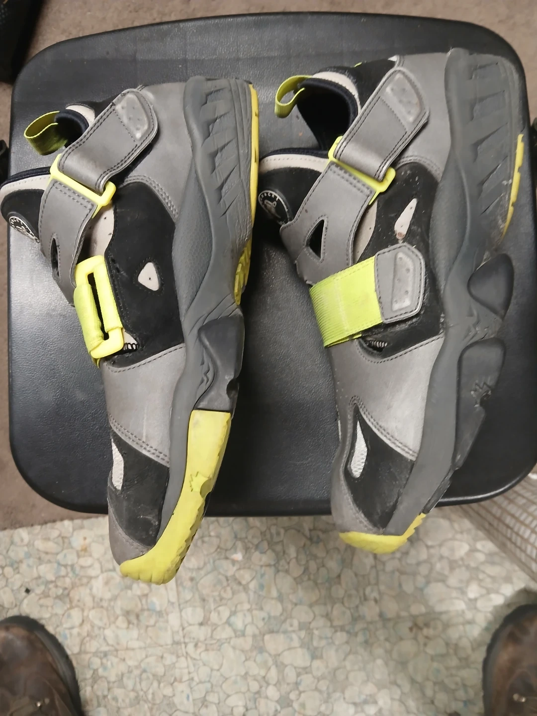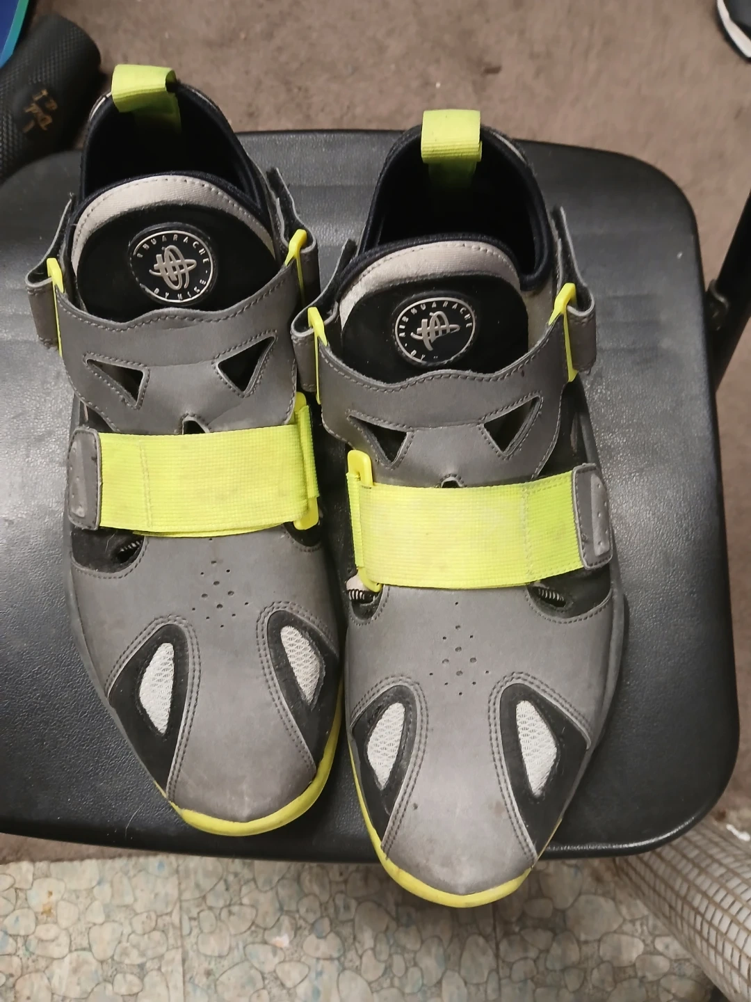 Grey, black, and neon yellow Nike Air Huarache Run Mid sneakers. Features adjustable ankle strap. Ideal for athletic activities or casual wear.