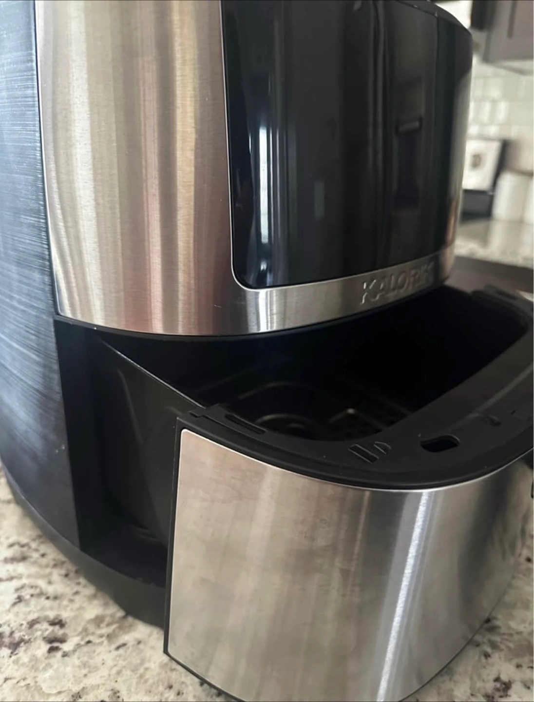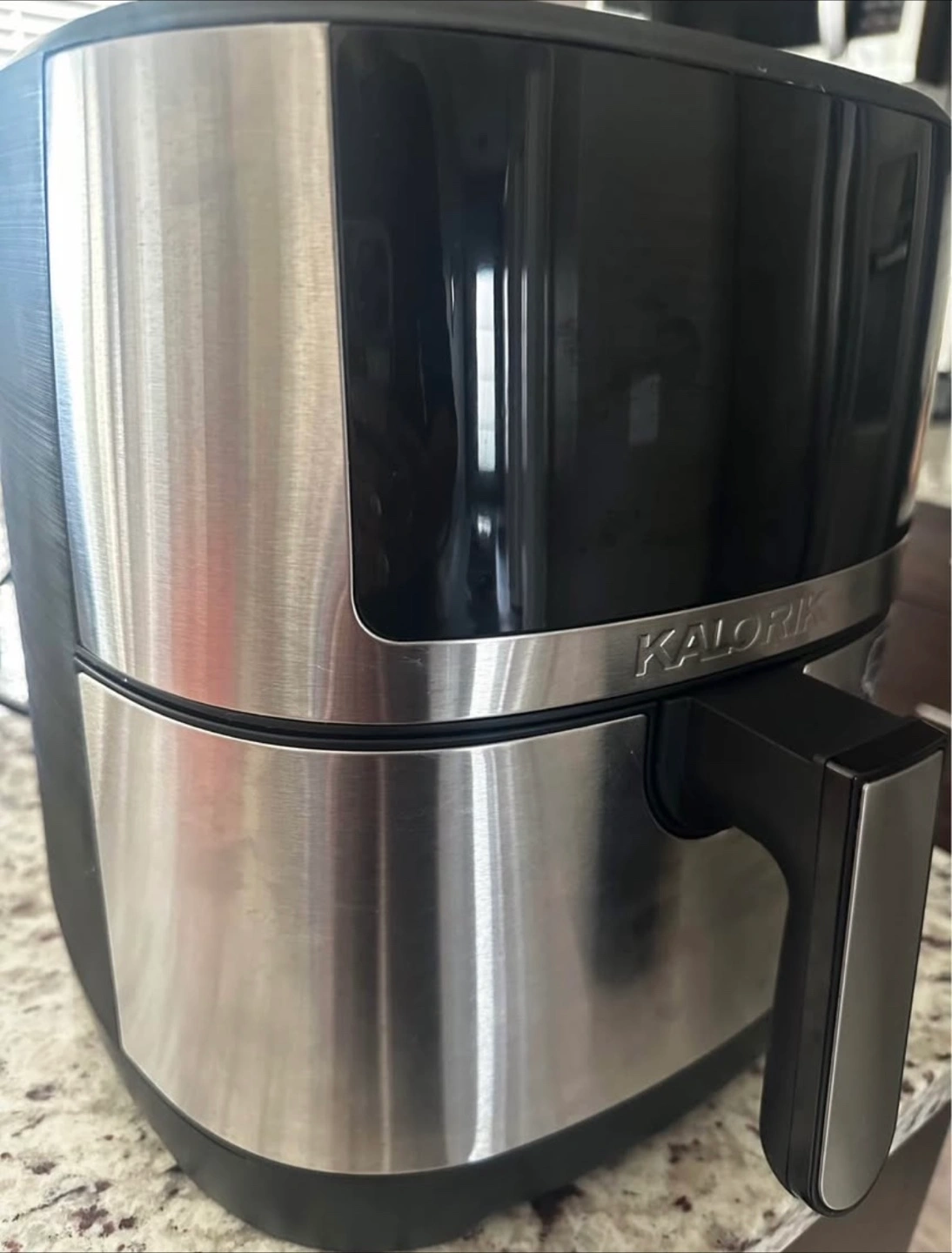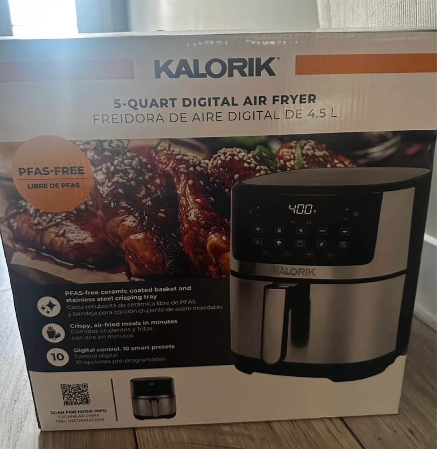 Selling a Kalorik 5-quart digital air fryer. It's in great condition and ready to crisp up your favourite meals. It features a PFAS-free ceramic coated basket and stainless steel crisping tray. Enjoy air-fried meals in minutes with its digital control and 10 smart presets! Used for 2 months for vegetarian meals only. No issues. Comes with original box.