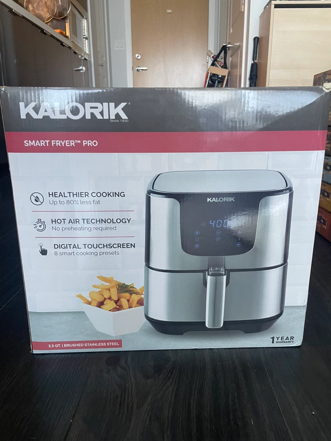 I'm selling a Kalorik Smart Fryer Pro! It's a 3.3 qt brushed stainless steel air fryer. It’s brand new, only ran once for test run. - Healthier cooking: Up to 80% less fat - Hot air technology: No preheating required - Digital touchscreen: 8 smart cooking presets It also features a 60 minutes timer with automatic shutoff, and quickly cooks food by circulating hot air inside the cavity to 400°F (200°C). The box is included! Pick up in Richmond.