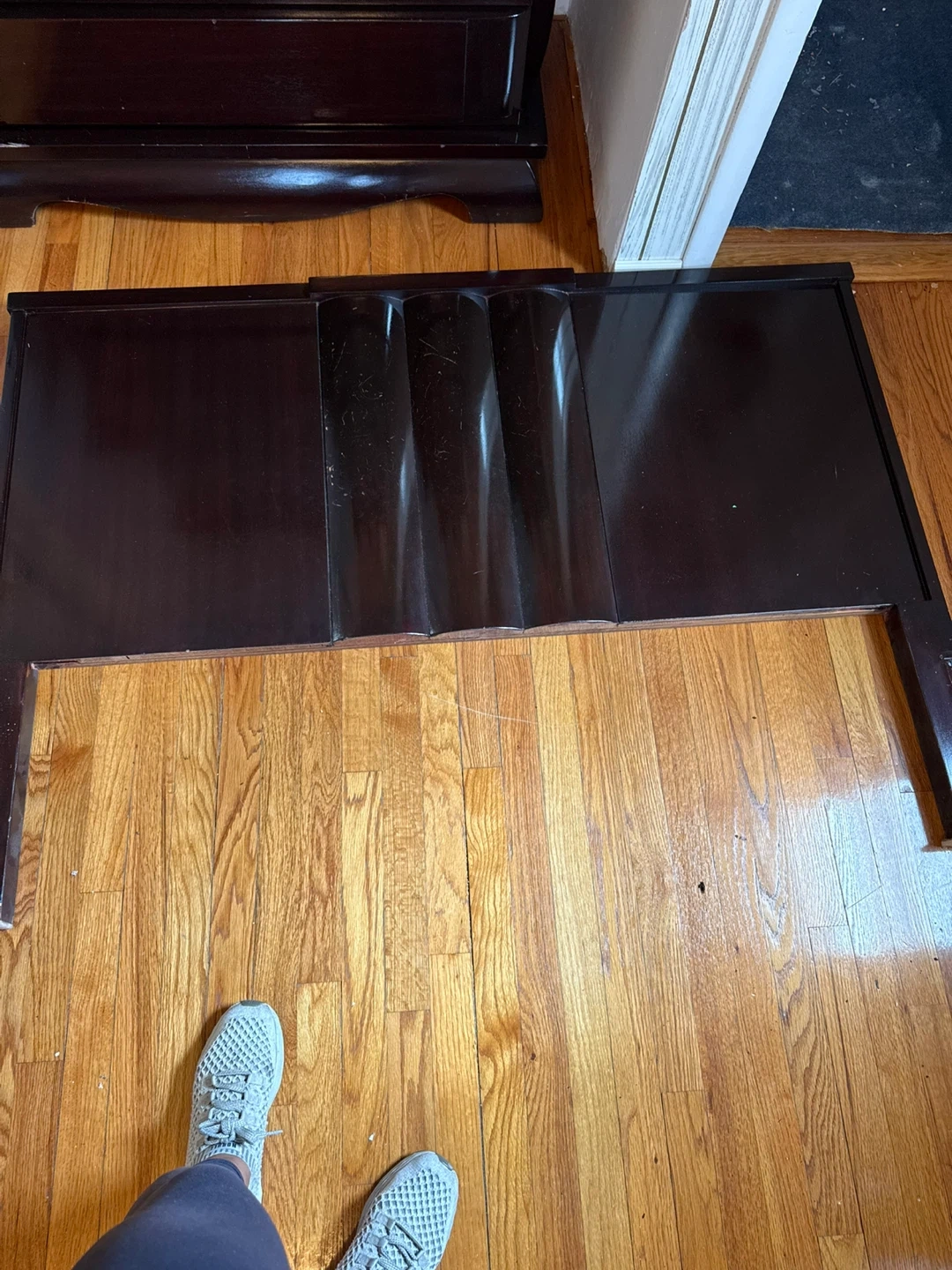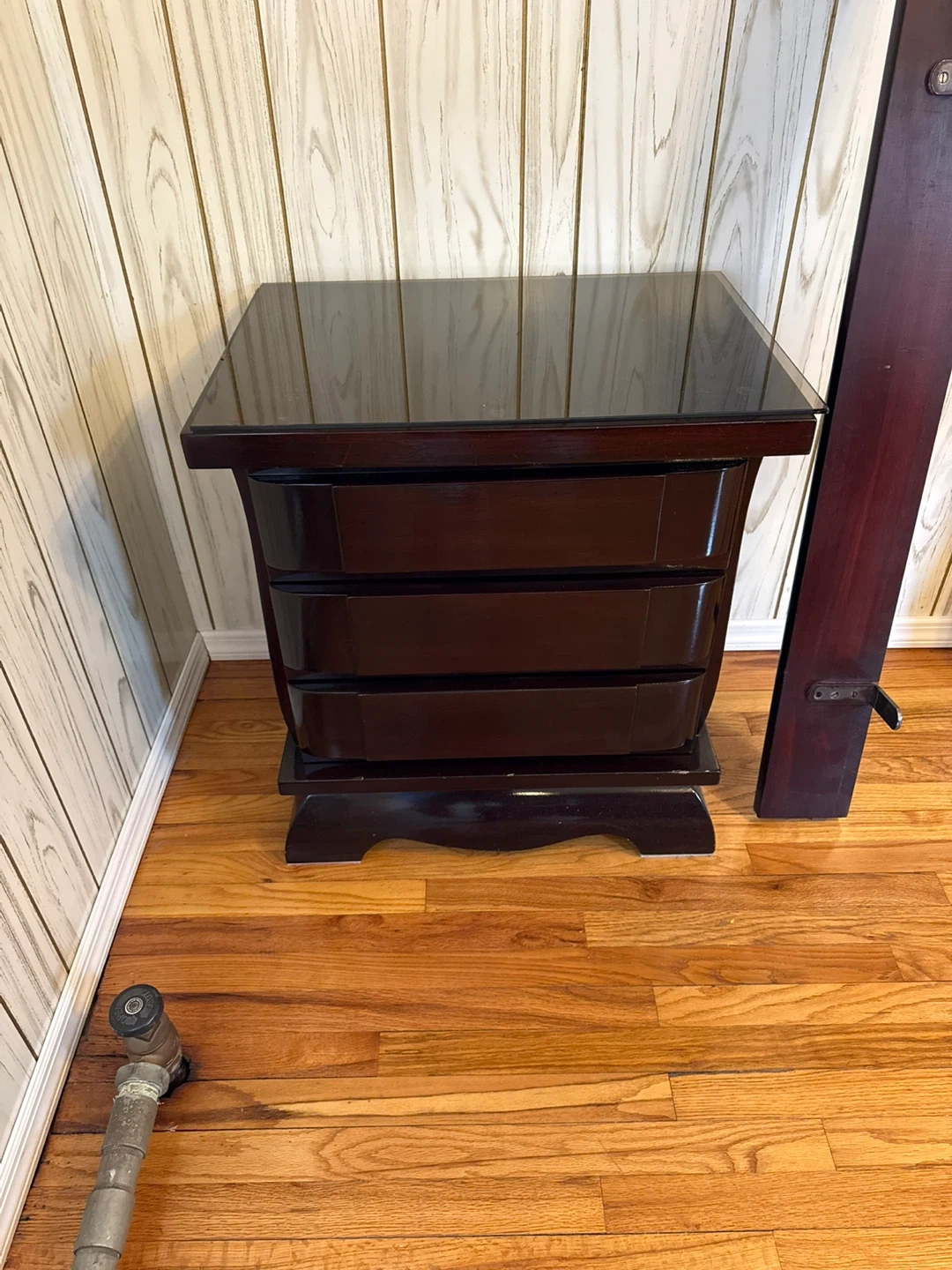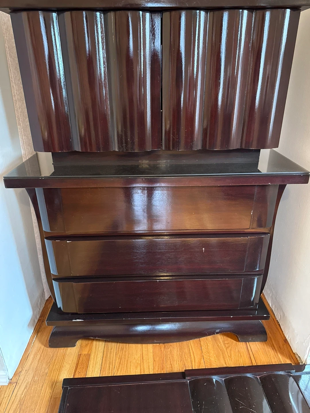 Dark wood dresser with fluted door details 9 drawers. Includes matching 2 dark wood nightstand with three drawers. Tall piece with 5 drawers Plenty of storage space and Headboard