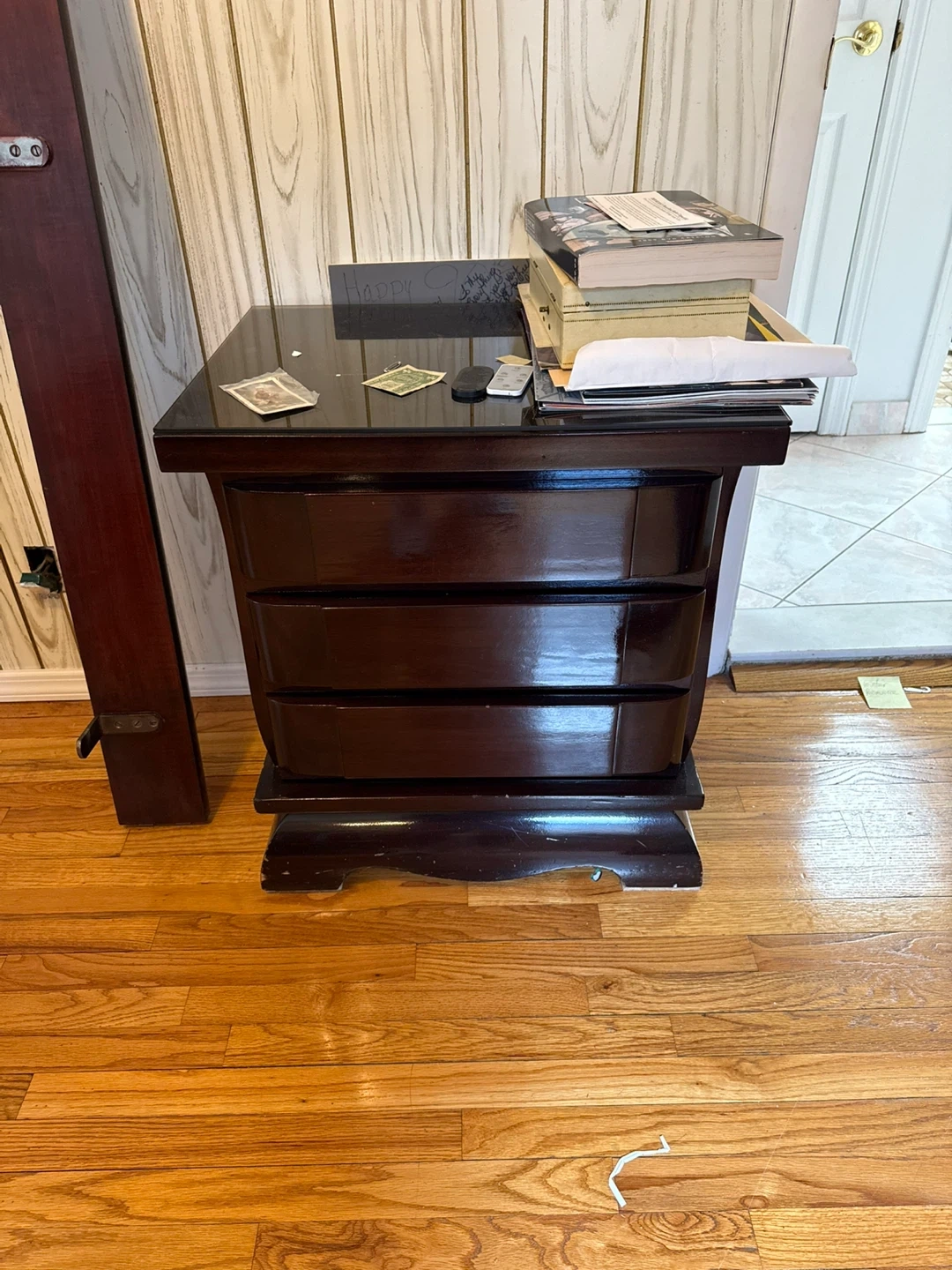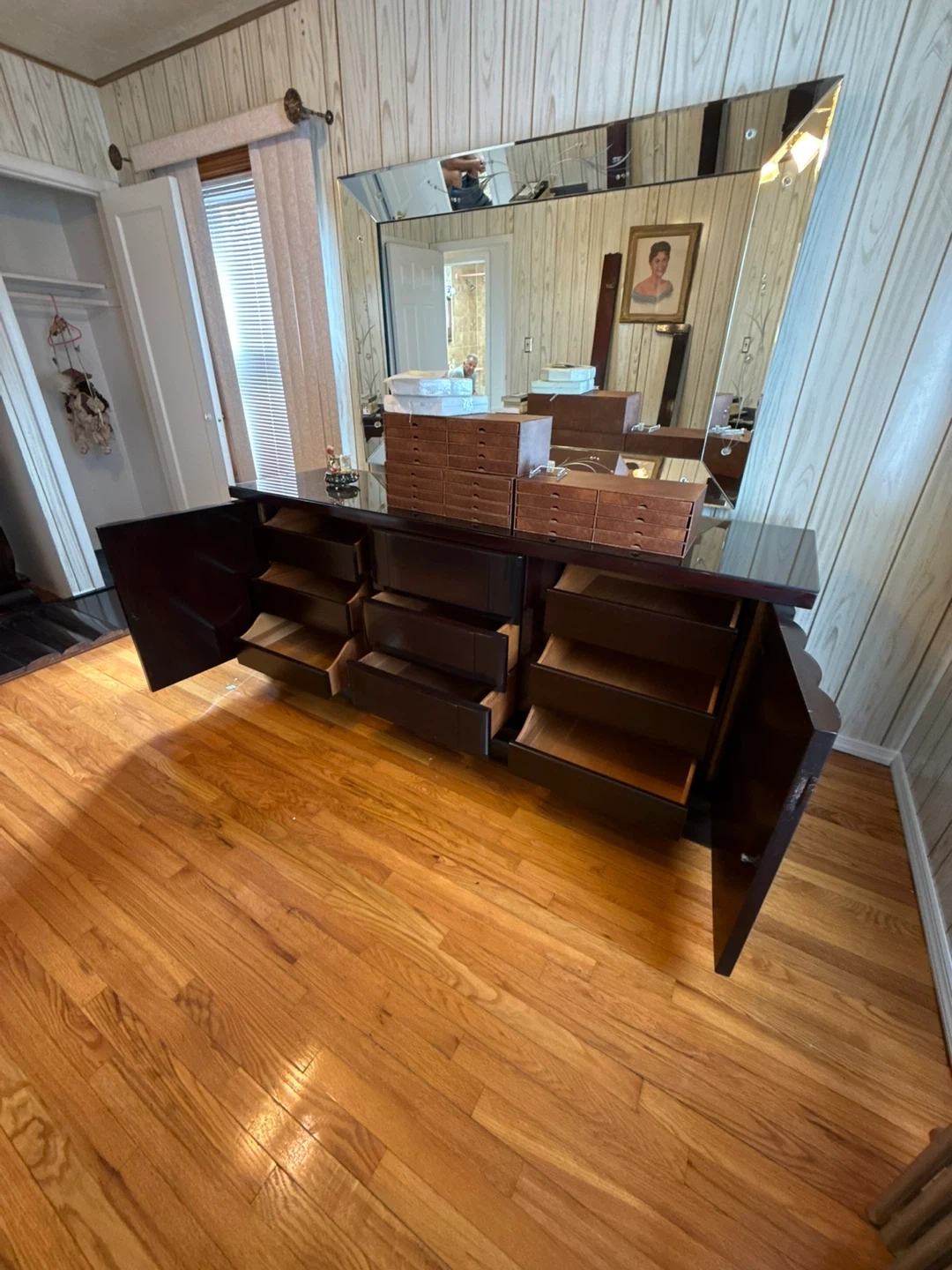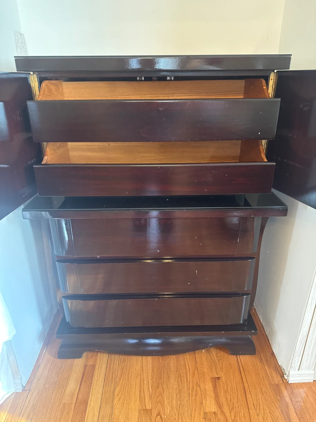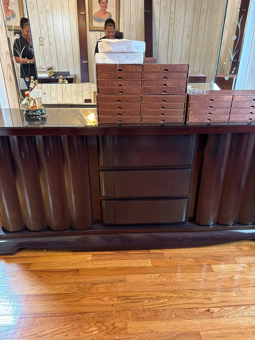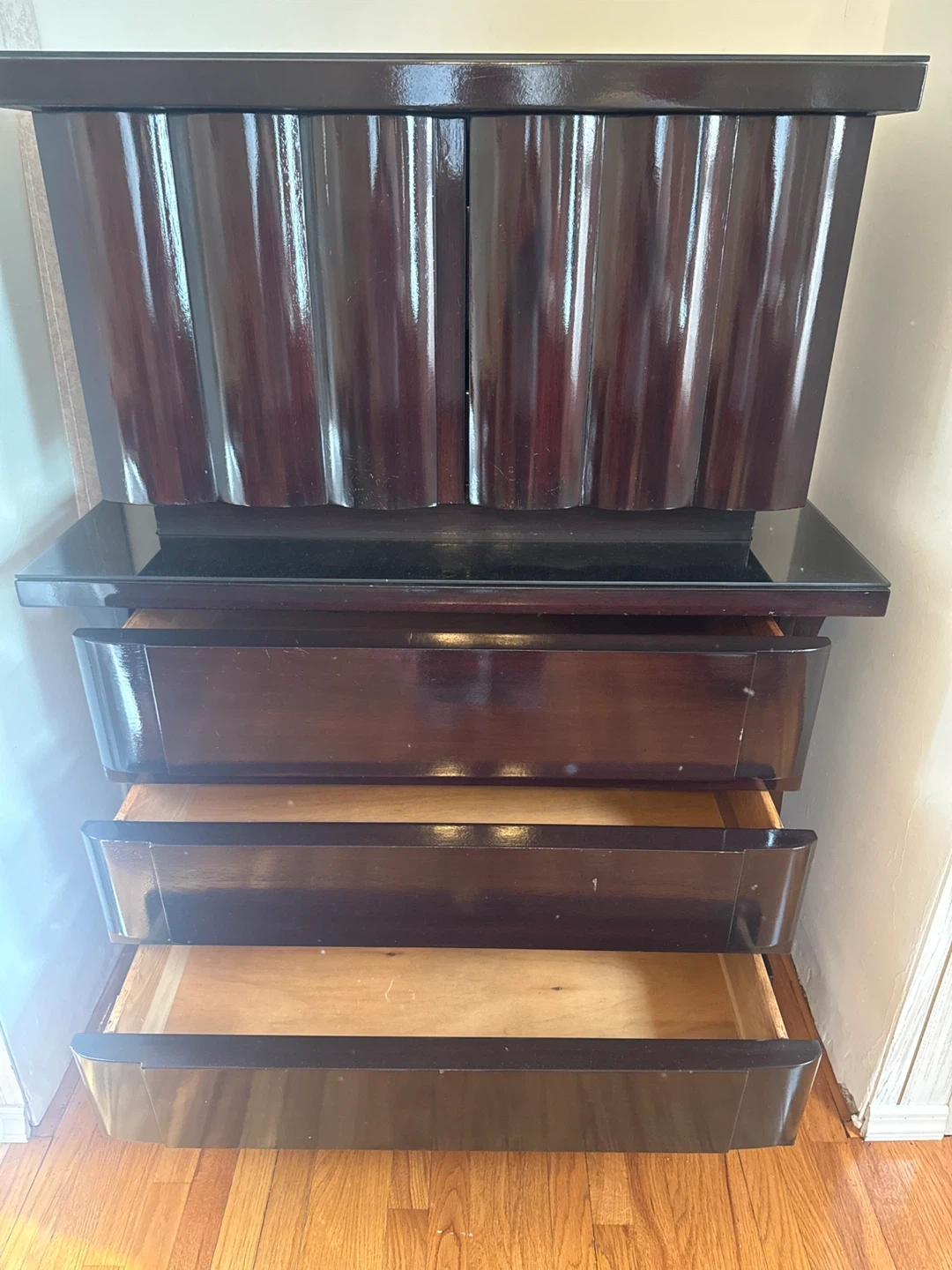 Dark wood dresser with fluted door details 9 drawers. Includes matching 2 dark wood nightstand with three drawers. Tall piece with 5 drawers Plenty of storage space and Headboard