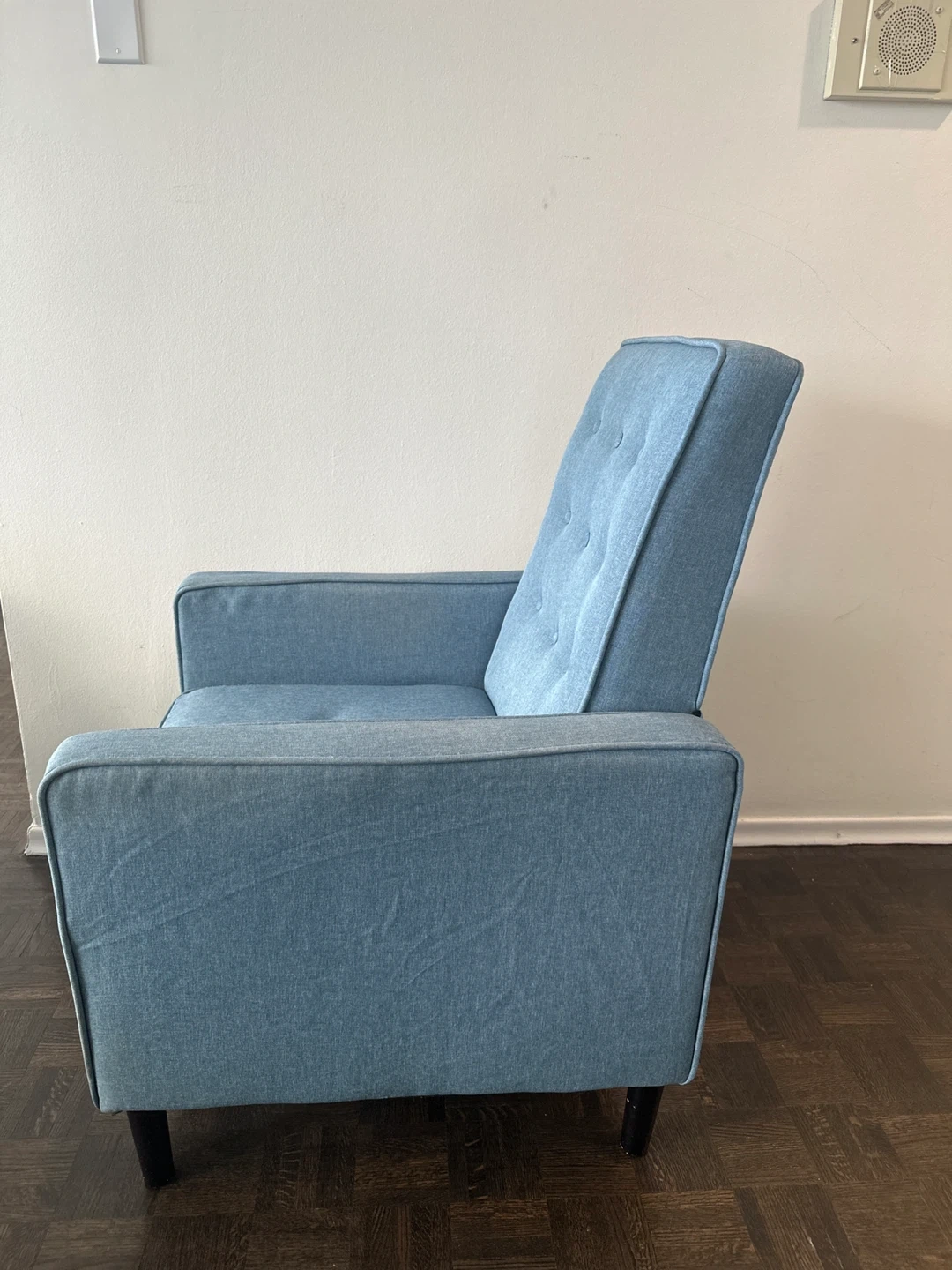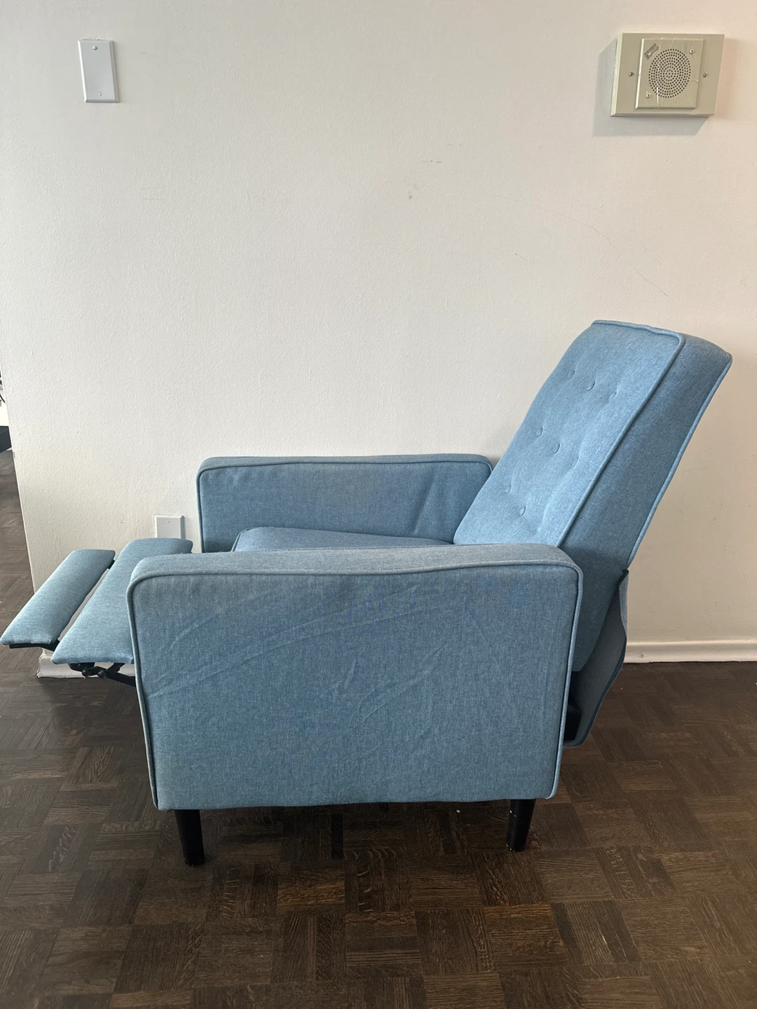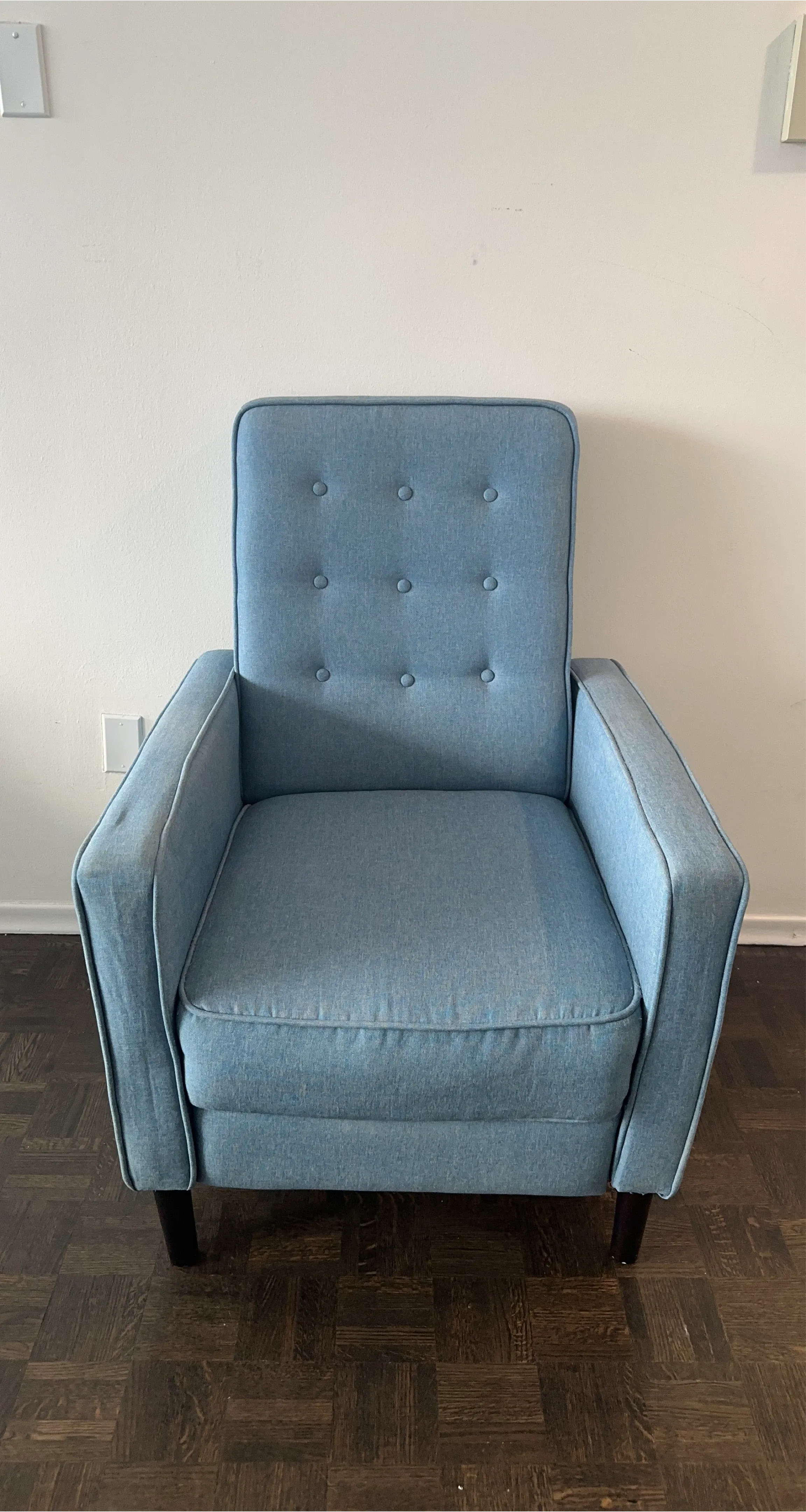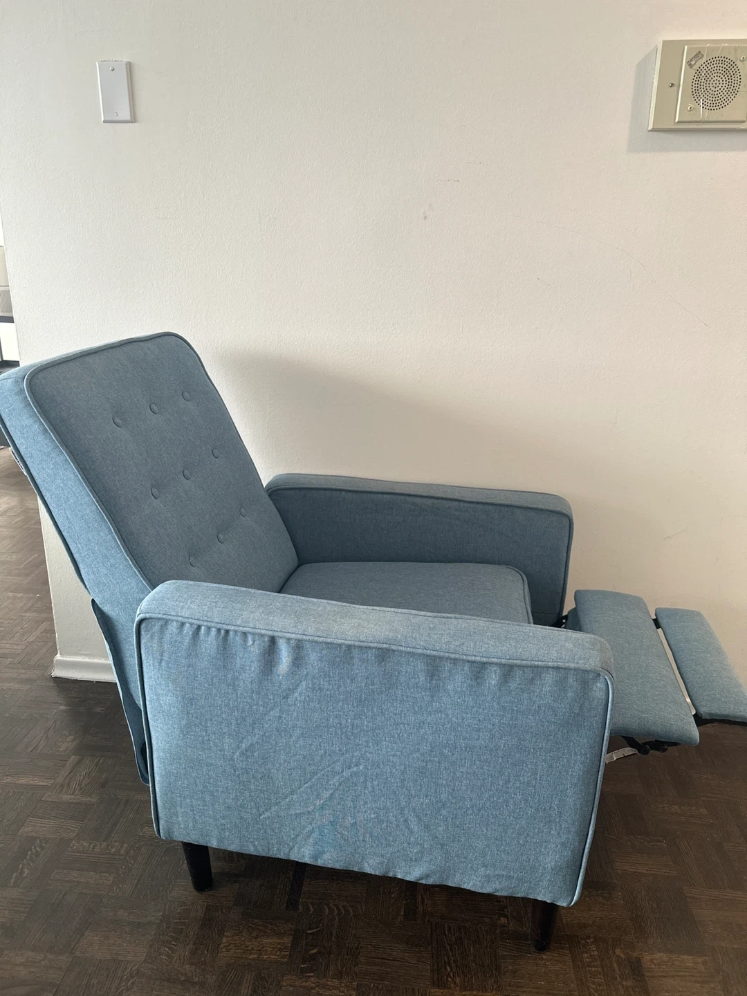 Comfortable blue recliner chair / armchair with a built-in footrest. Tufted back and sturdy design. It's made of durable fabric. It can be easily dismantle if needed for transportation and fits in small car if dismantled.