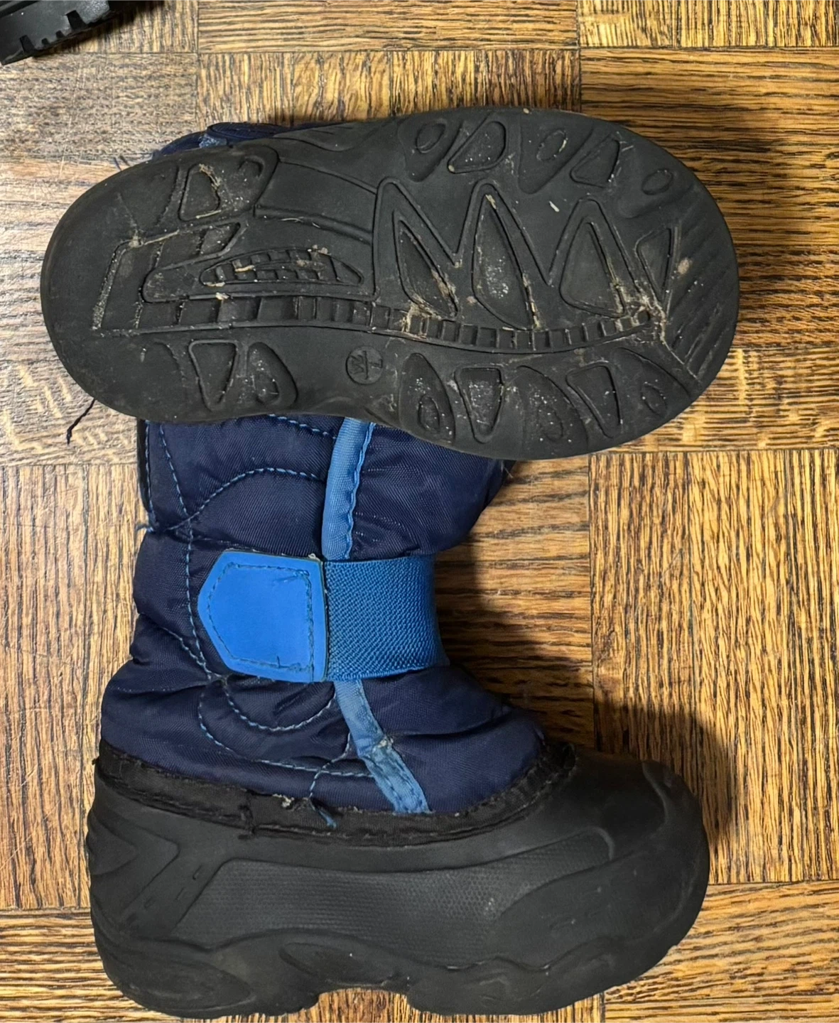 137Selling a pair of blue winter snow boots, perfect for keeping your little one's feet warm and dry this winter! They feature a sturdy black sole and a Velcro strap for a secure fit. The boots are in used condition, as you can see from the soles, but still have plenty of life left in them