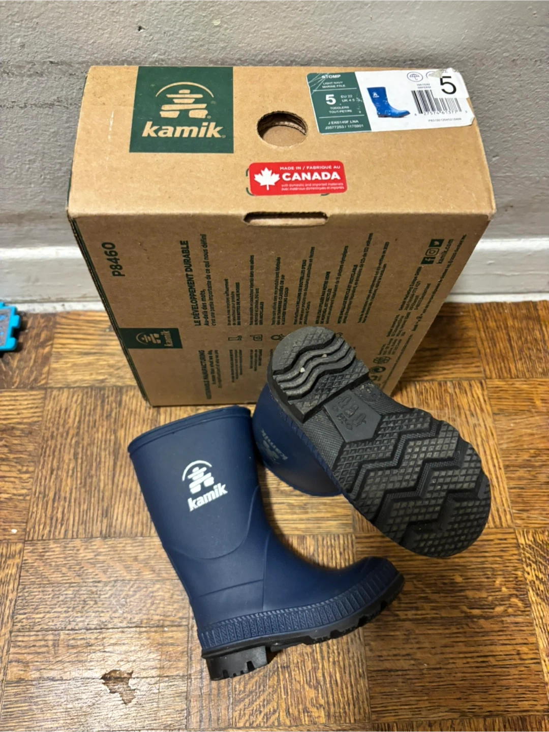 137Selling a pair of Kamik Stomp rain boots in navy blue, size 5. These are perfect for little ones to splash around in! The box is included.