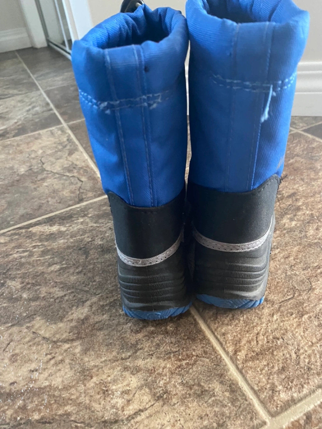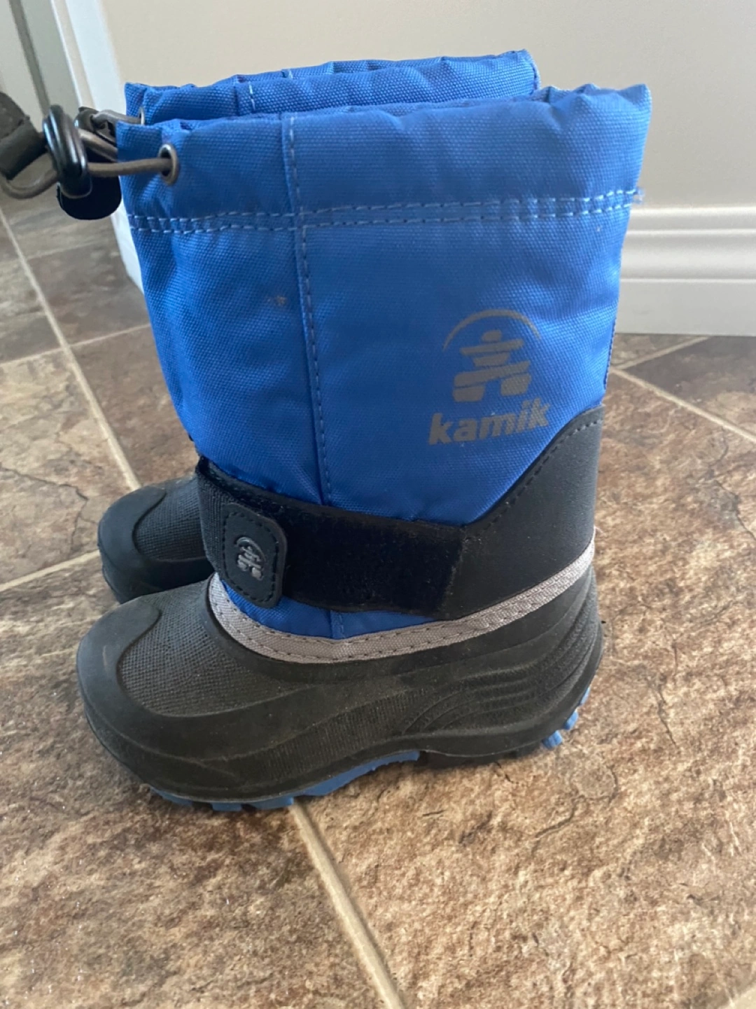 Blue and black toddler snow boots. Size 6. Excellent condition. Warm and waterproof. Drawstring closure at top.