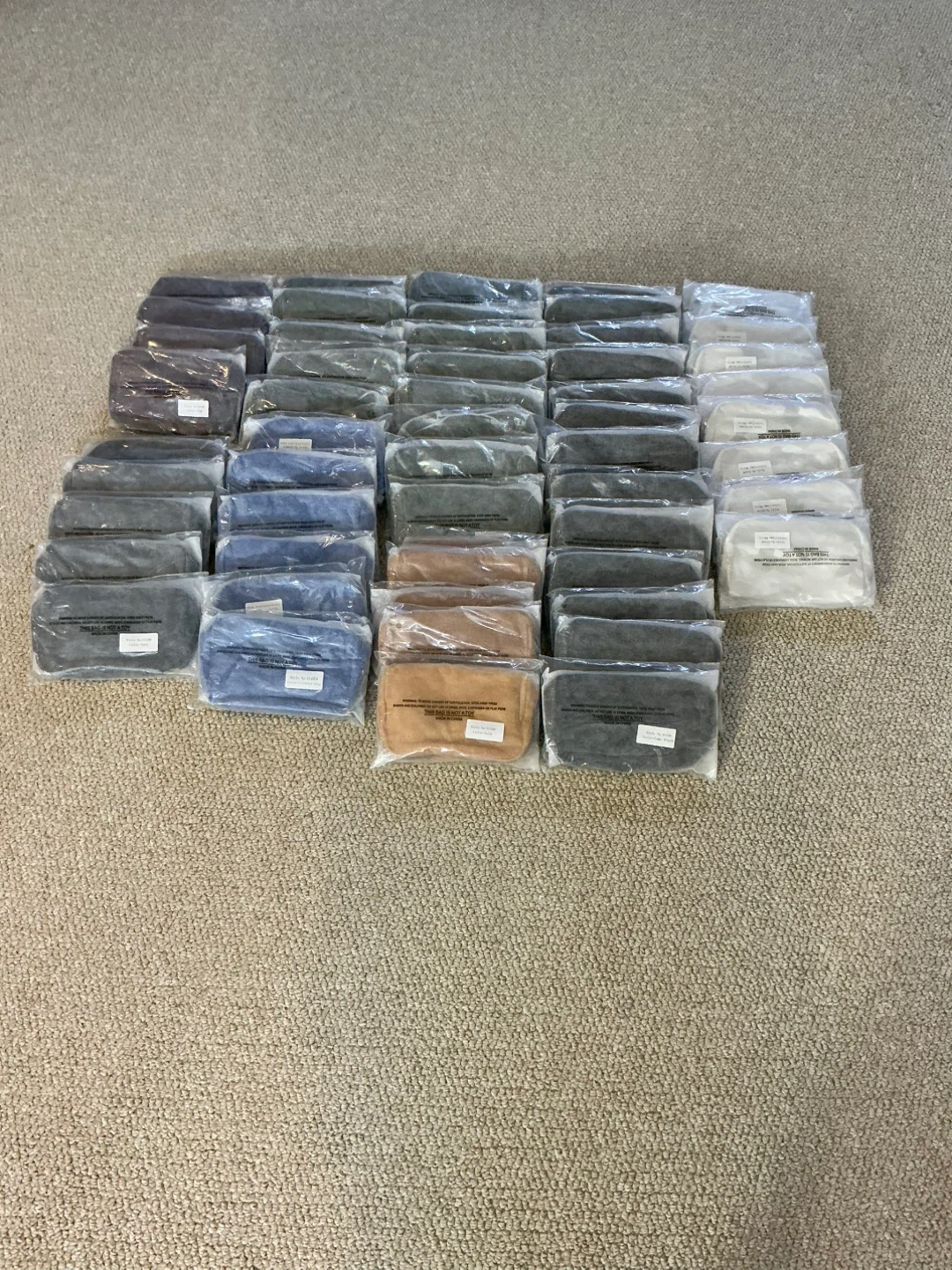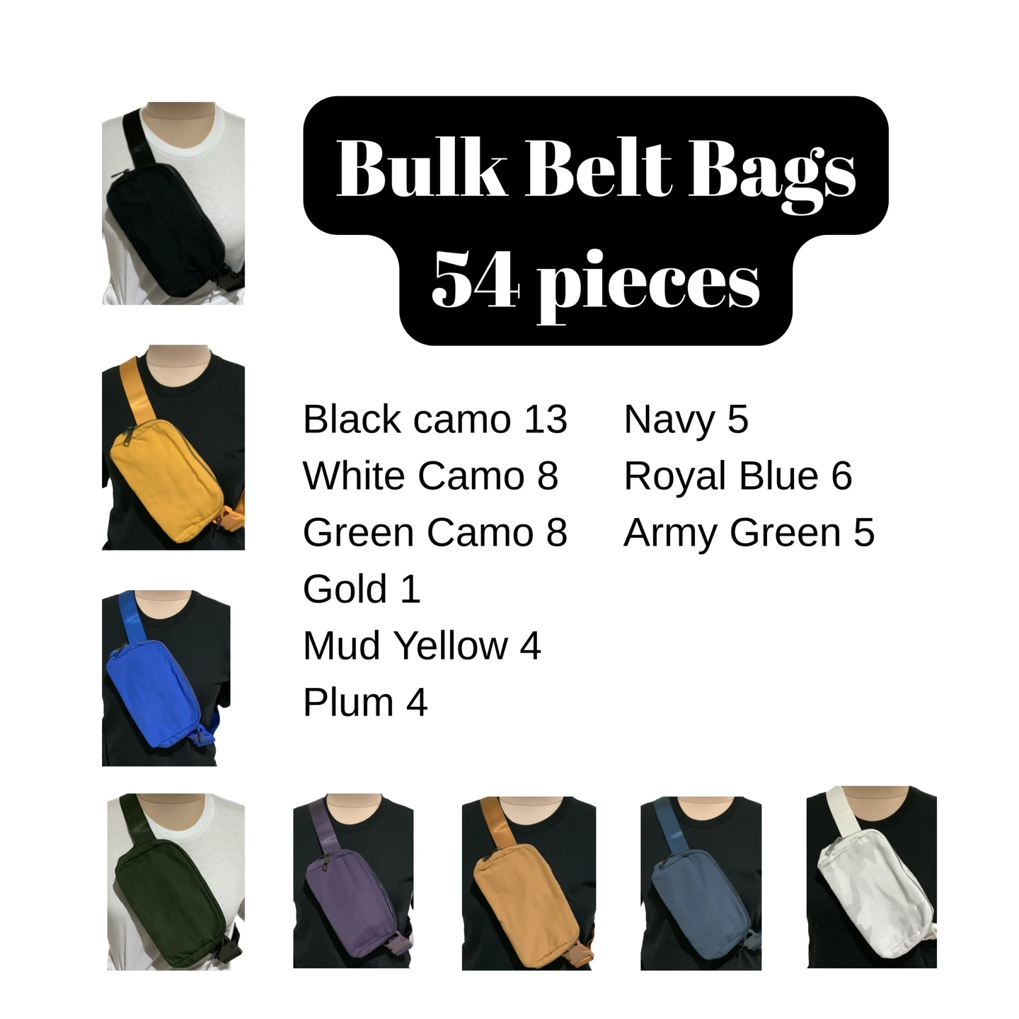 Bulk lot of 54 belt bags in various colours, including black camo, white camo, green camo, gold, mud yellow, plum, navy, royal blue, and army green. Perfect for resale or a large group event!