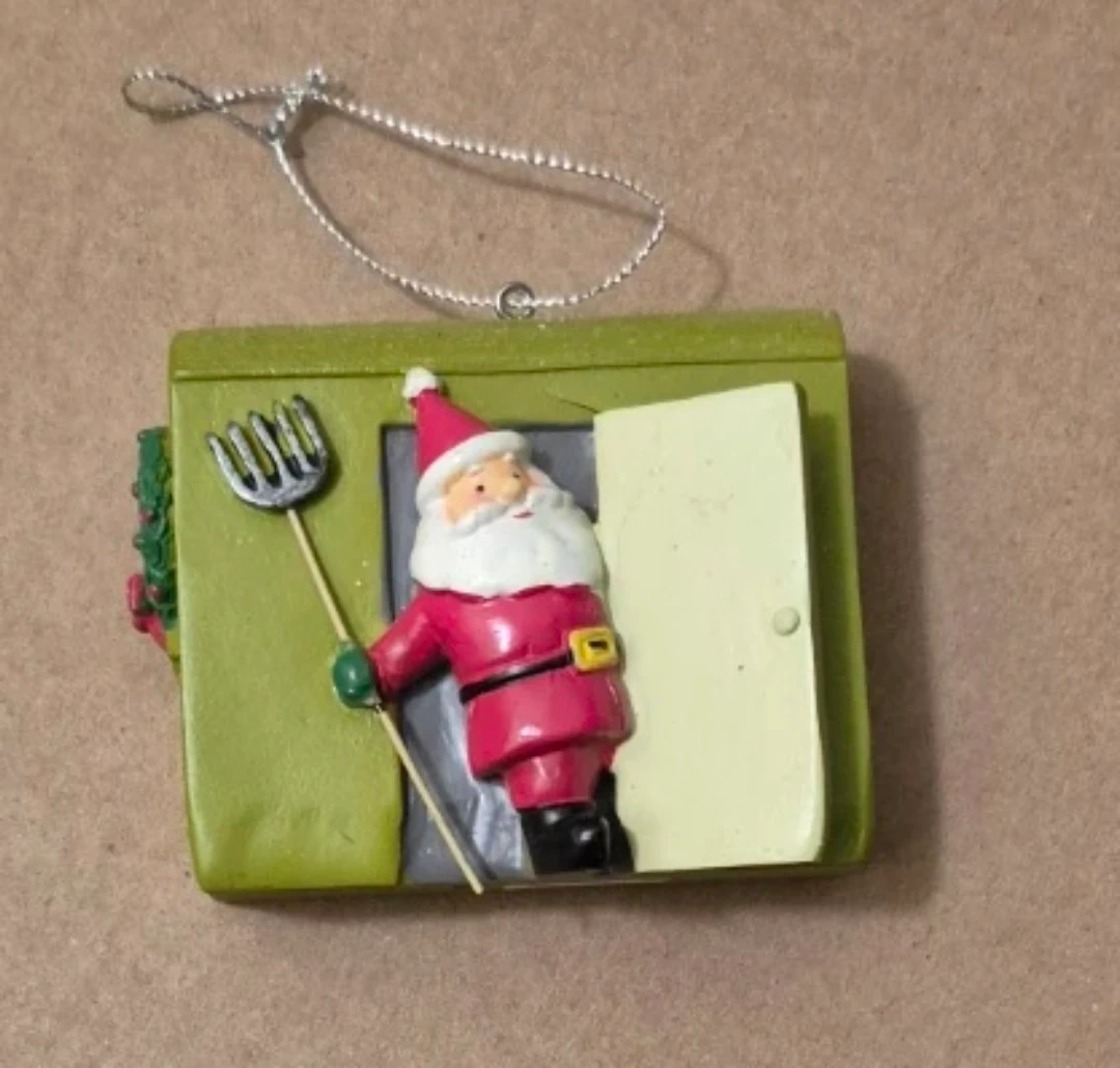 This fun Christmas ornament features Santa Claus holding a pitchfork! It's a unique addition to your holiday tree.