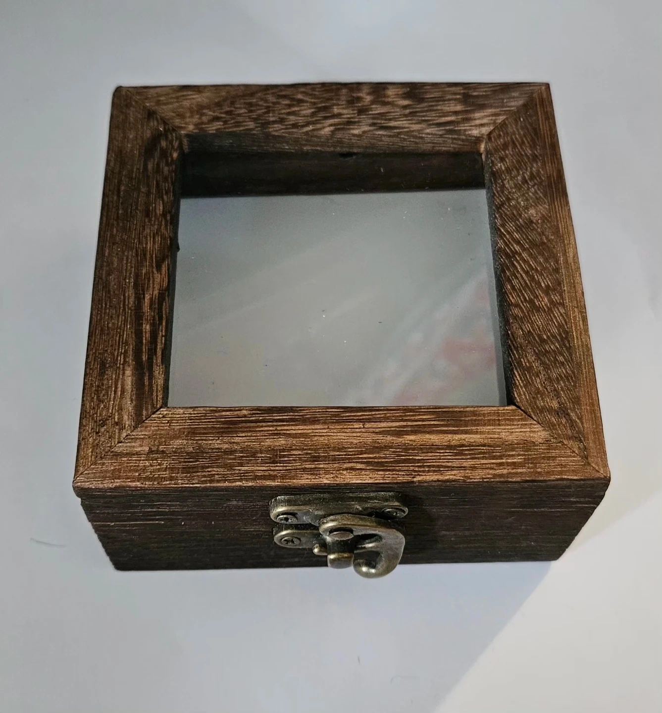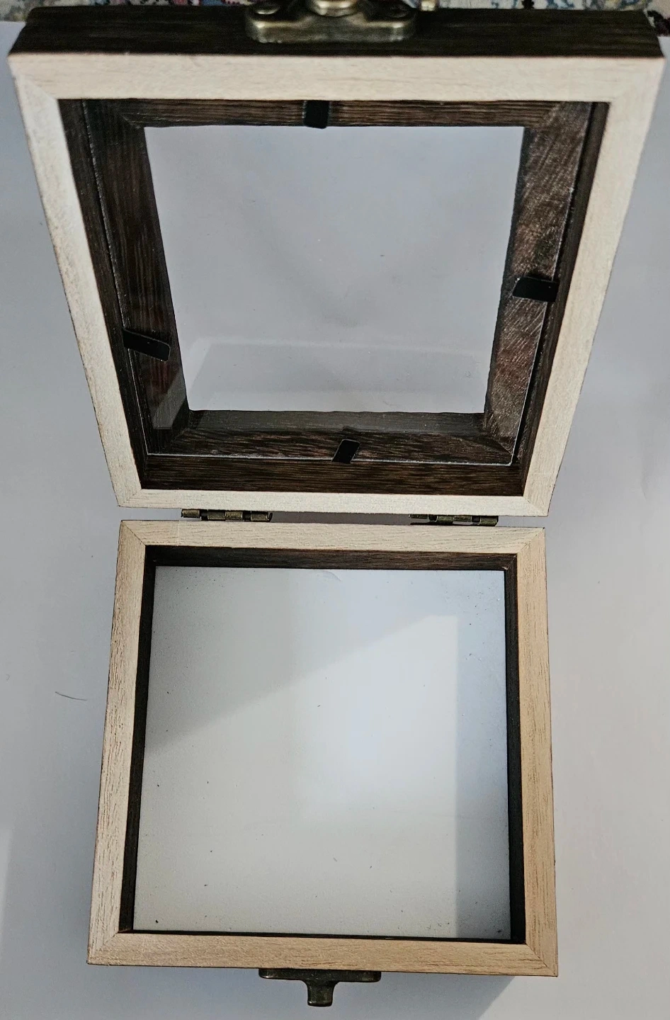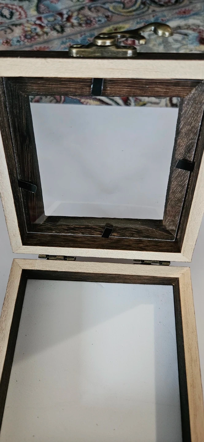 These two wooden shadow boxes feature hinged lids and metal clasps. The interior is frosted white, perfect for displaying small treasures. Great for small keepsakes or trinkets!