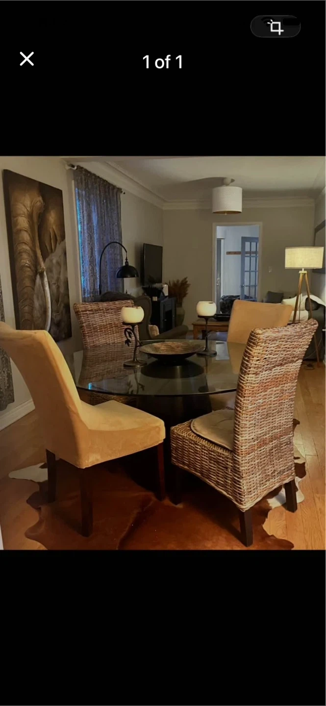 This dining set features a round glass-top table with a dark black base. Chairs not included. 55 inches wide 29 inches height