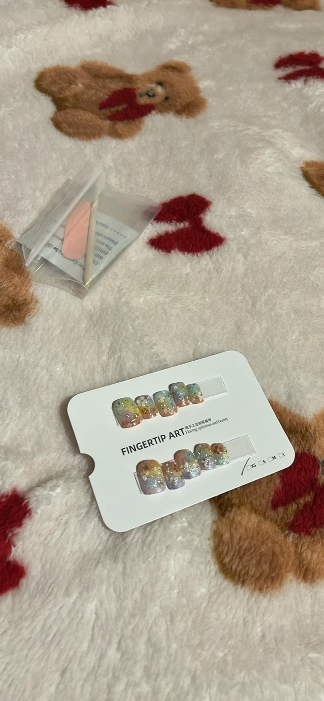 Selling a set of Fingertip Art press-on nails. These are handmade and come in sizes XS. Perfect for adding a touch of optimism and beauty to your look!