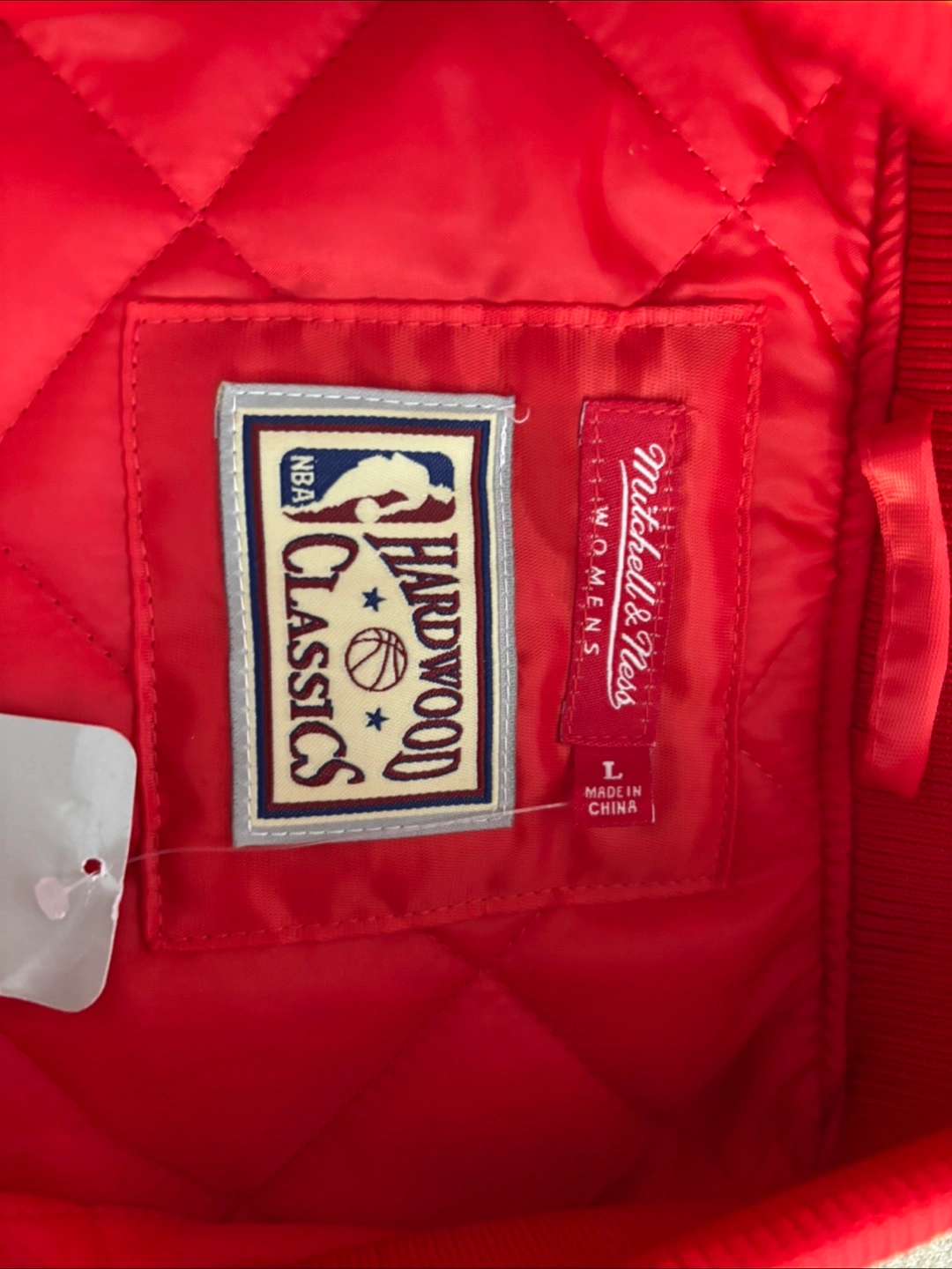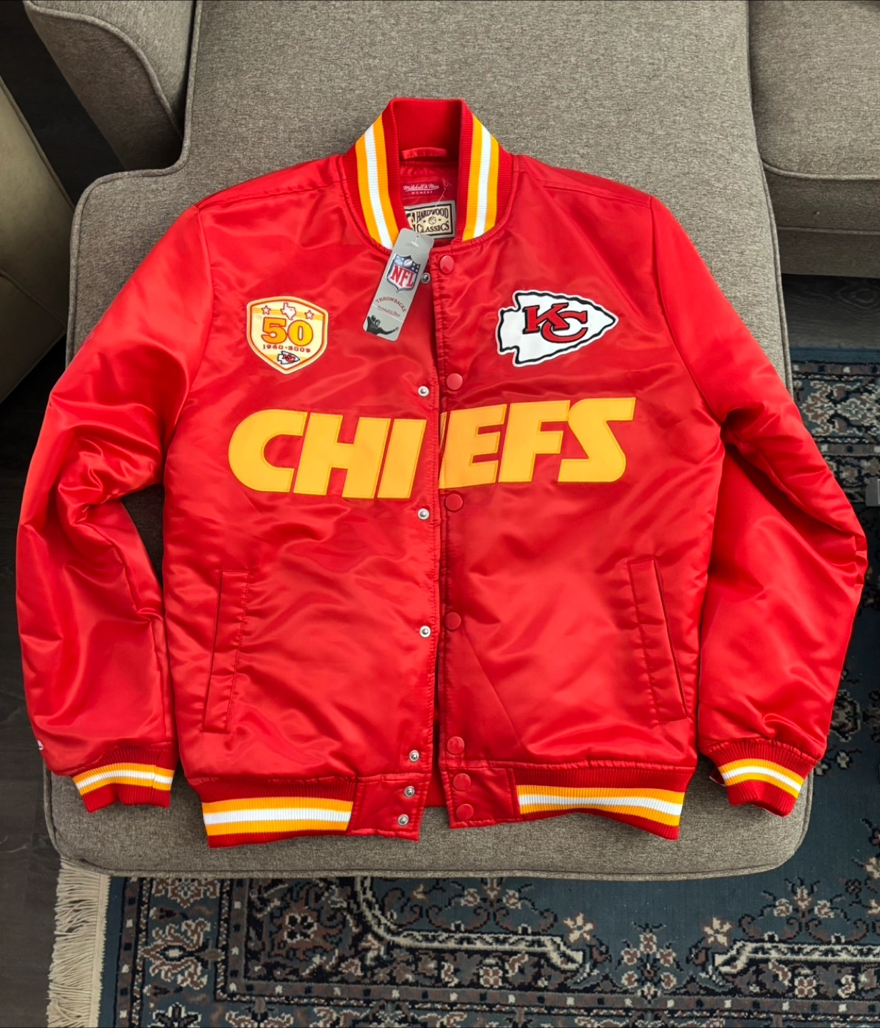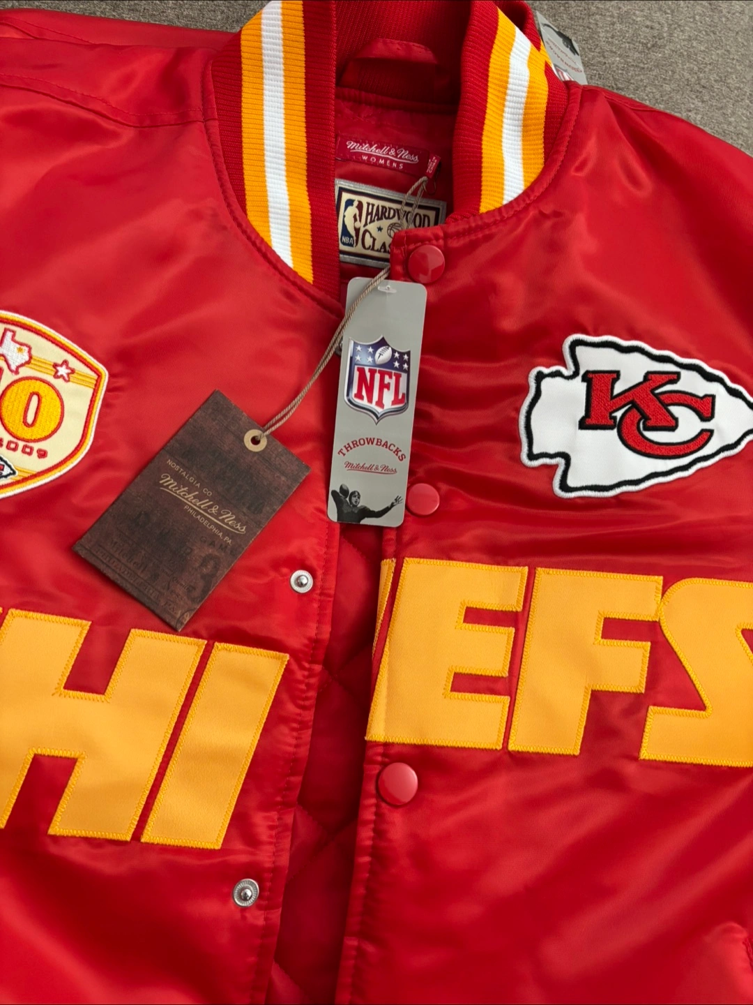 Women's size medium / large red satin bomber jacket. Features Chiefs logo and 50th anniversary patch. Mitchell & Ness Hardwood Classics branding. New with tags.