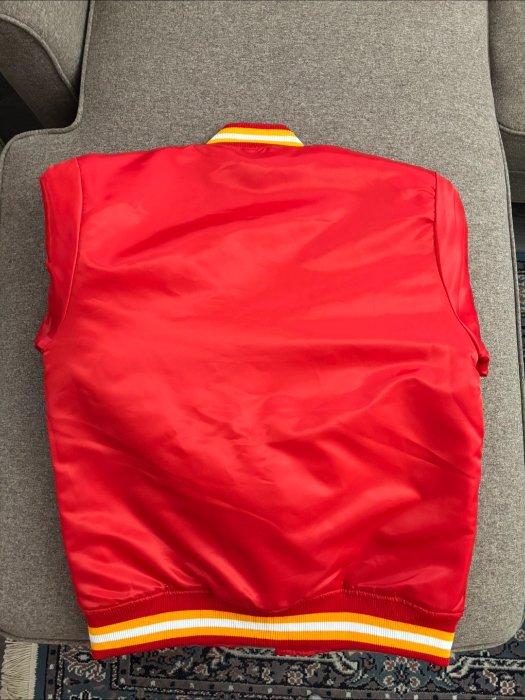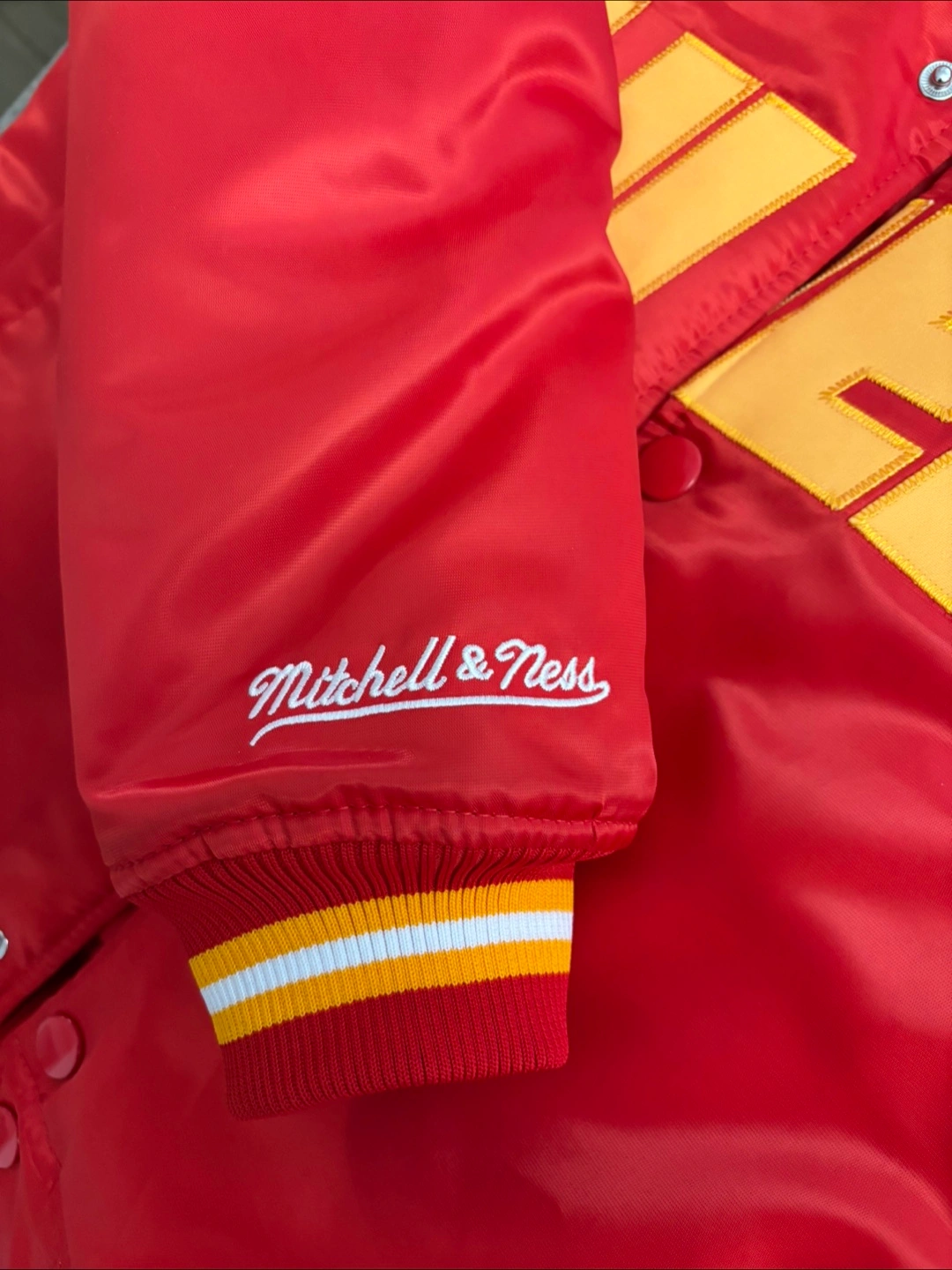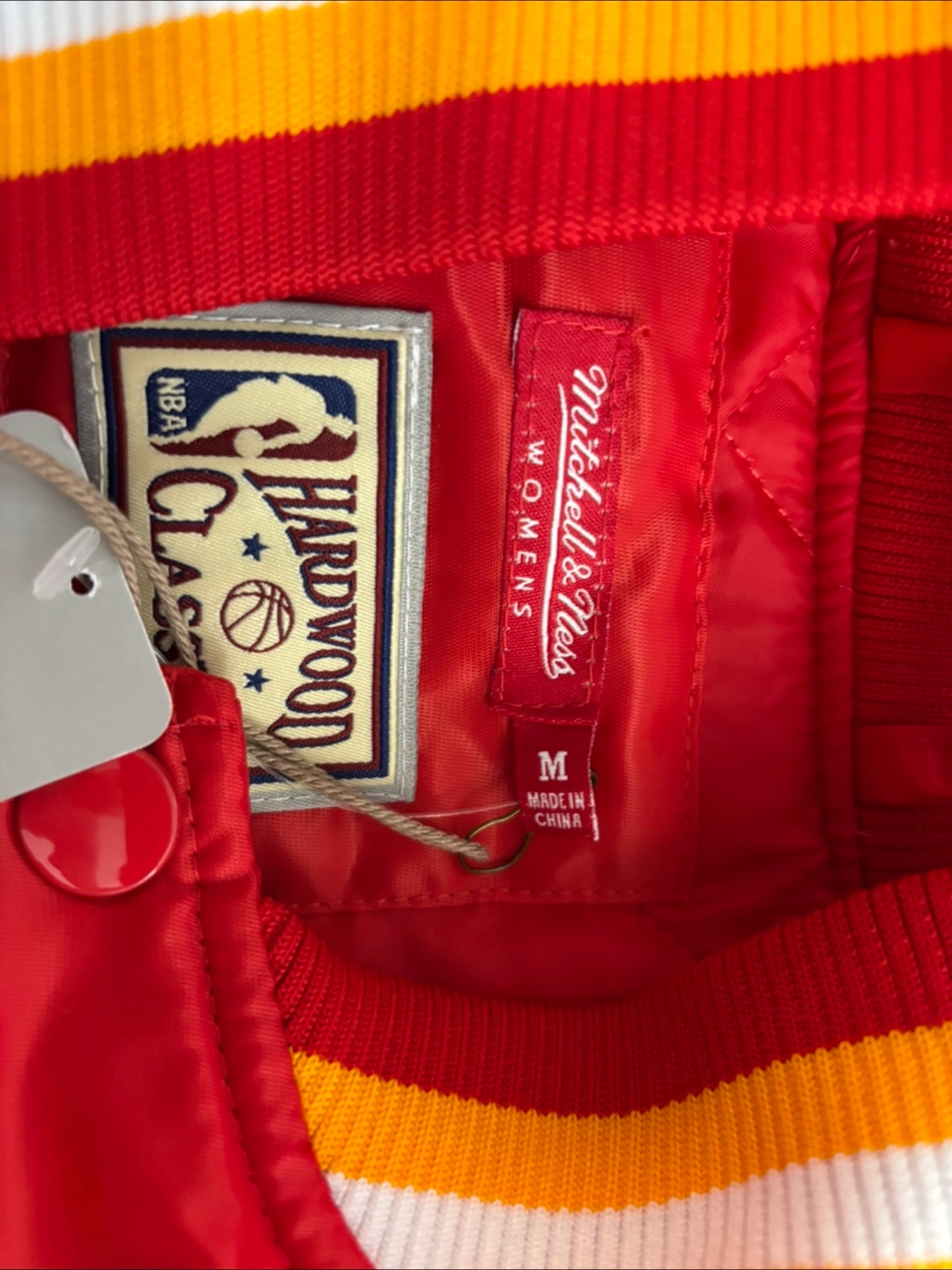 Women's size medium / large red satin bomber jacket. Features Chiefs logo and 50th anniversary patch. Mitchell & Ness Hardwood Classics branding. New with tags.