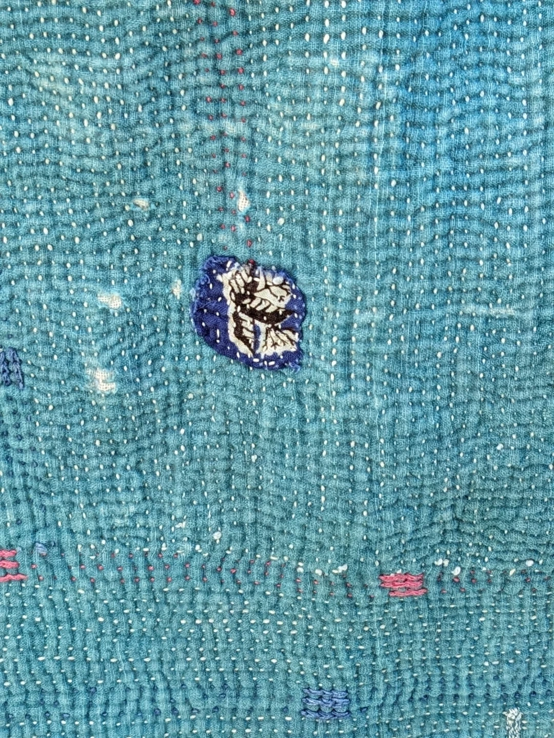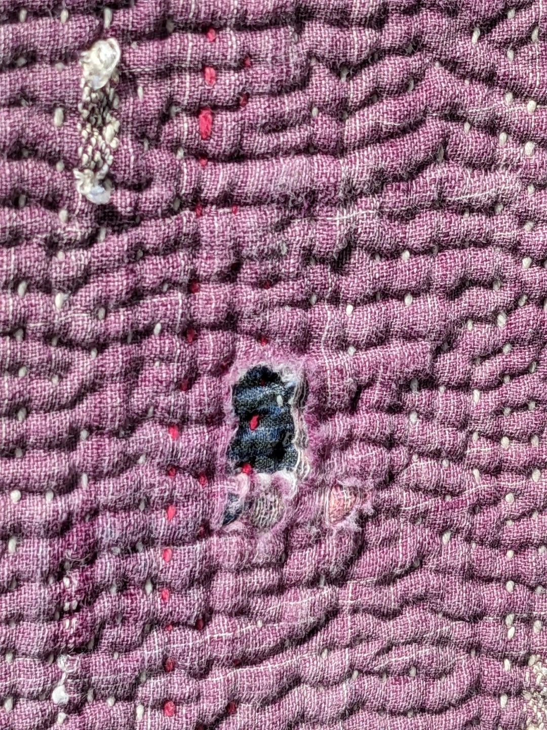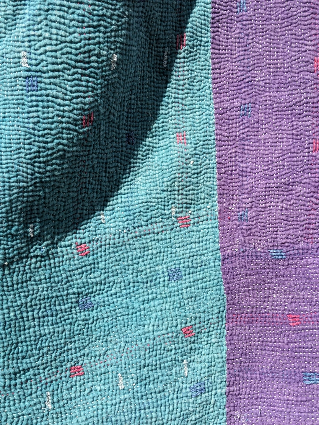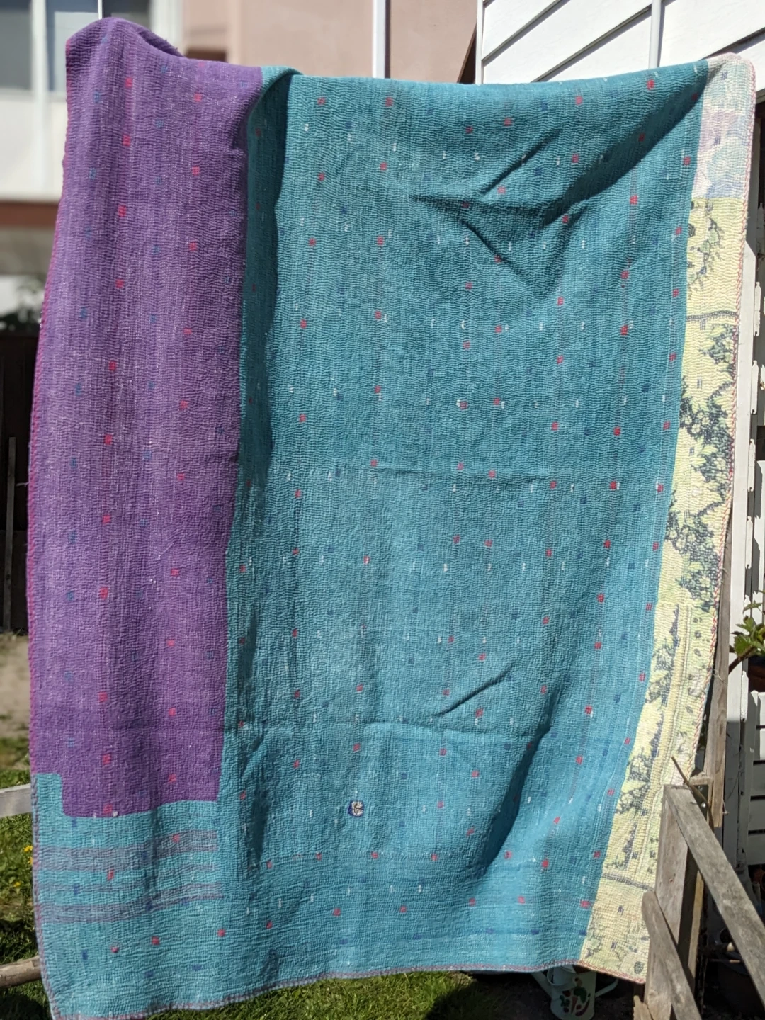 145This is a beautiful Kantha quilt with a unique design and texture. It features a mix of purple, blue, and green colours. Perfect as a throw blanket or decorative piece! This is vintage quilt. There is some spots and torns part. But this is totally new and perfect condition ✨