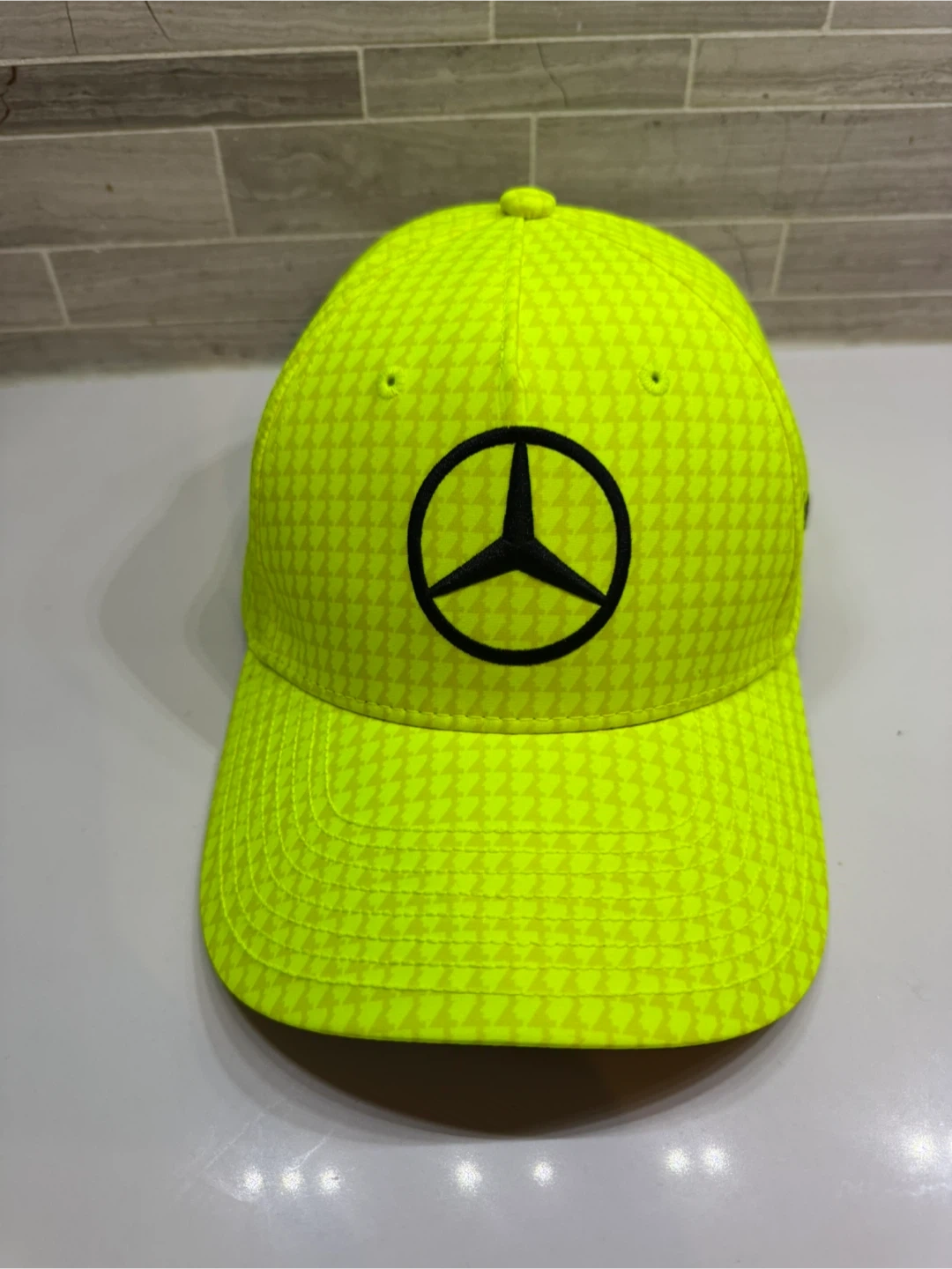 Neon yellow baseball cap with the Mercedes-AMG Petronas Formula One Team branding. Features an adjustable strap for a comfortable fit. A great piece for any racing fan!