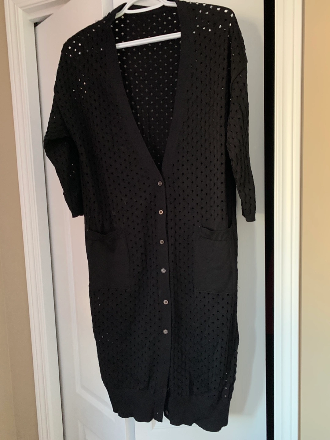 Long black cardigan. Features eyelet detailing throughout. Three quarter sleeves. Button closure. Two pockets.