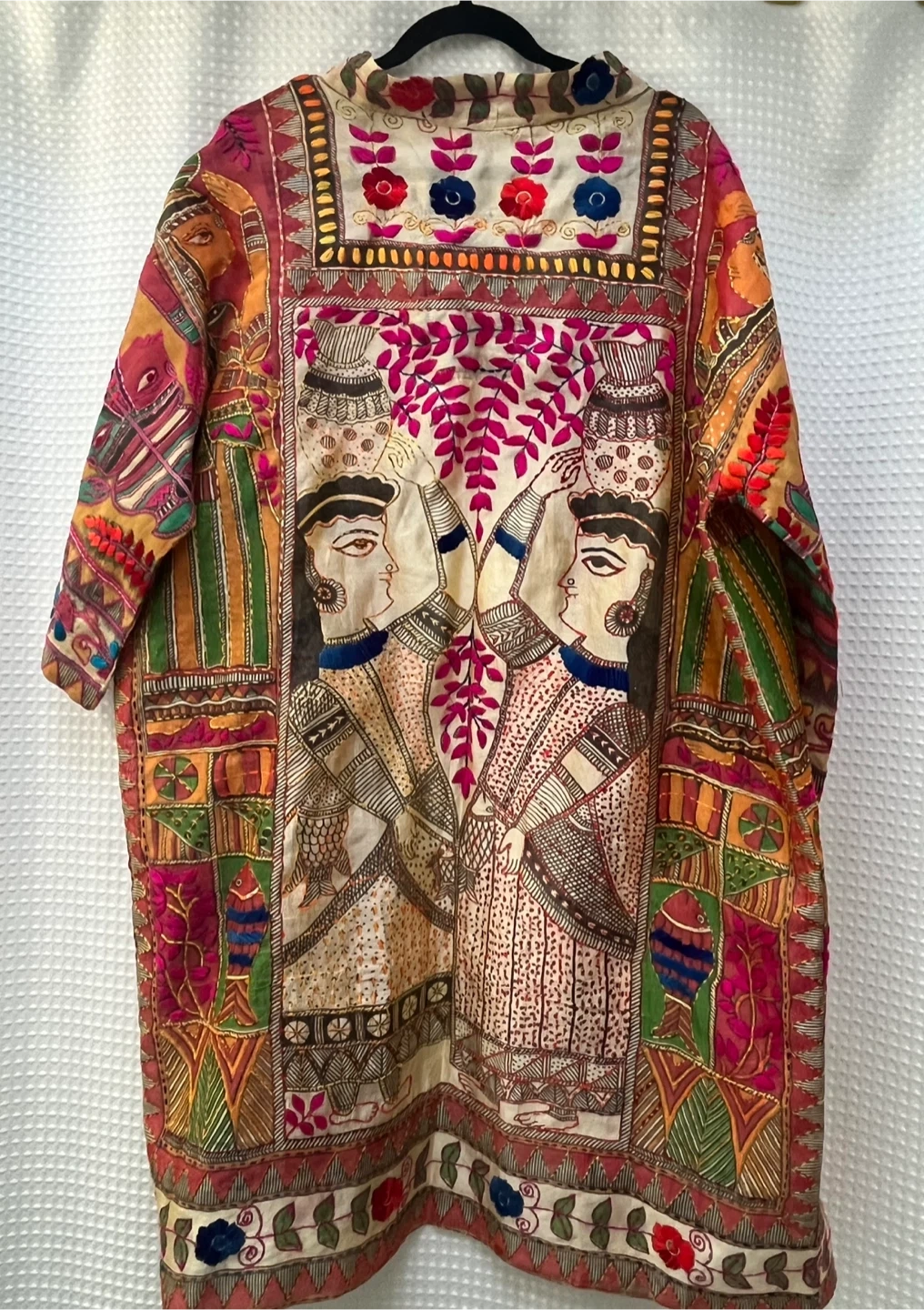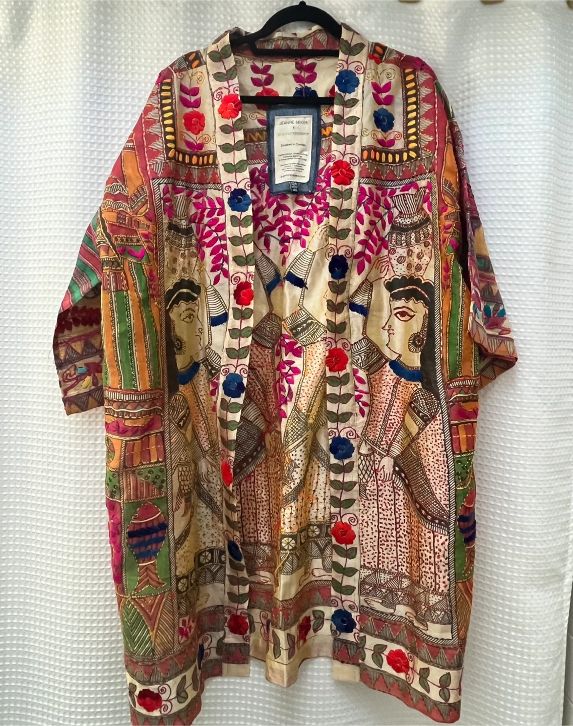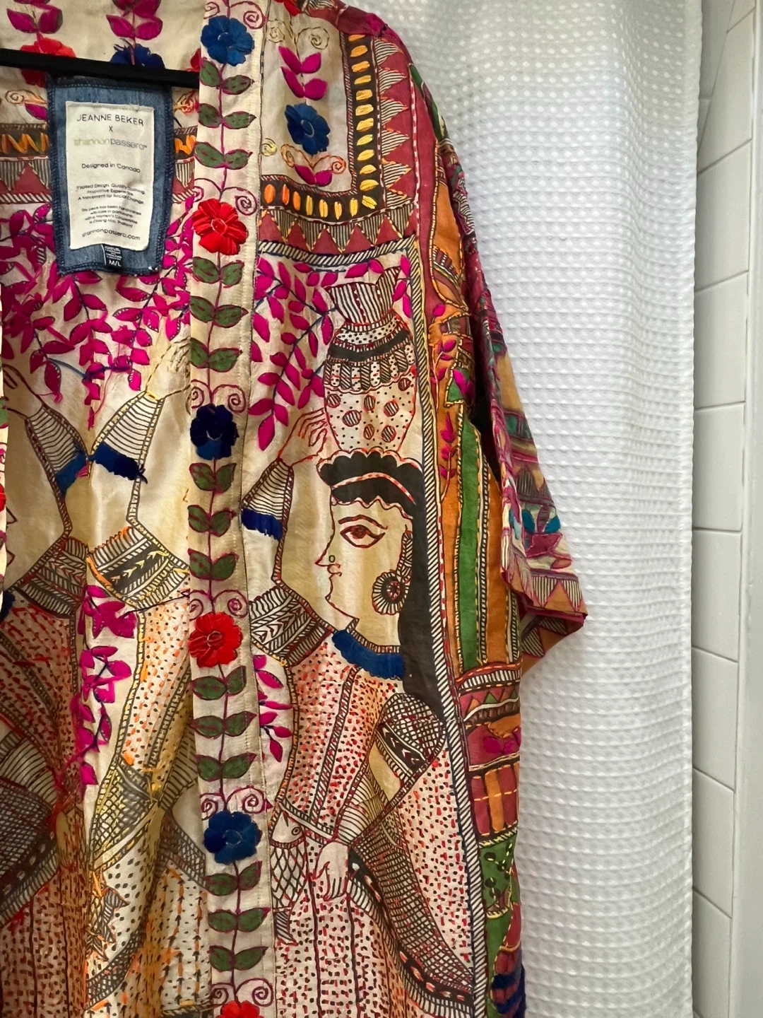 Beautifully designed kimono from Jeanne Beker x Shannon Passero. Features intricate embroidery and a vibrant, unique print. Designed in Canada. Made in Thailand. Size M/L. This kimono is a work of art. Tons of embroidery over Indian print. Lightweight and great for warm weather.