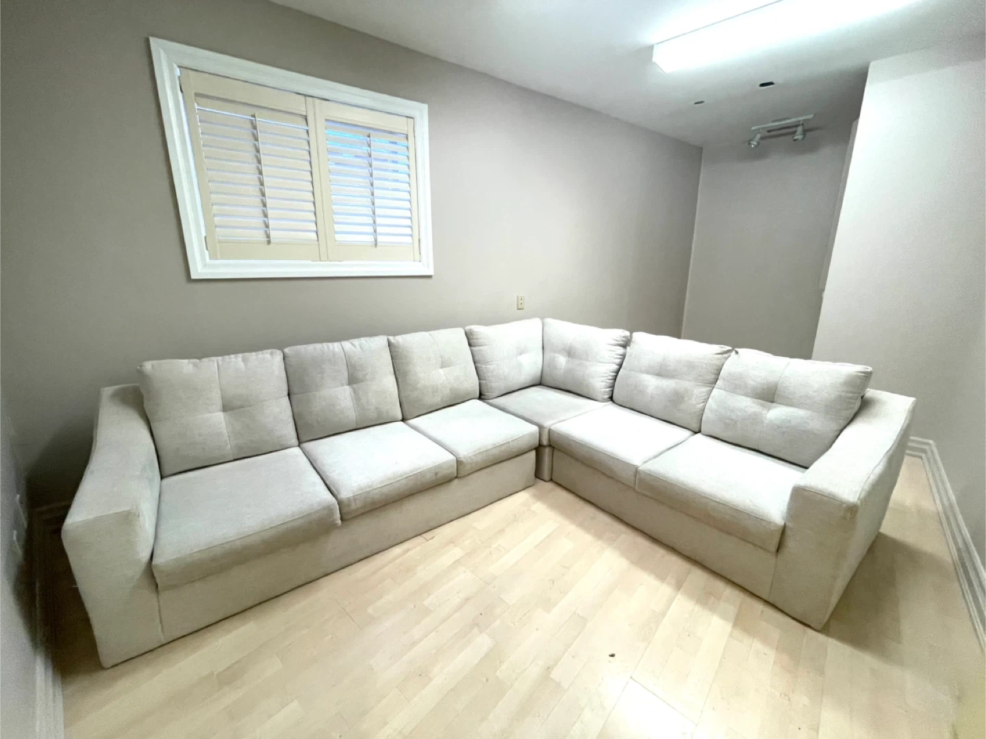 Greyish/cream sectional sofa. Amazing quality. Very comfortable. The seats feel like new. No snags or rips. Only needs a good shampoo. Available any time for pick up. We can help load. In Bolton Queen St & King St across from Tim Hortons. From a smoke free & pet free home.
