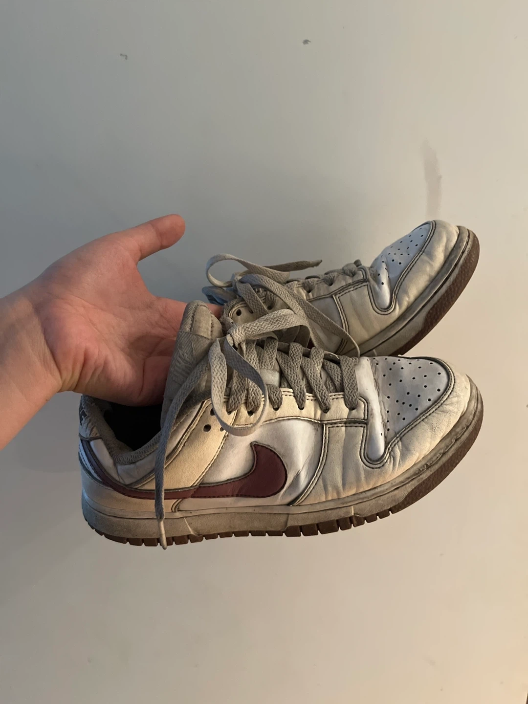 A pair of pre-owned Nike Dunk Low sneakers. These shoes feature a white leather upper with burgundy accents and a rubber sole. They're a classic low-top design.