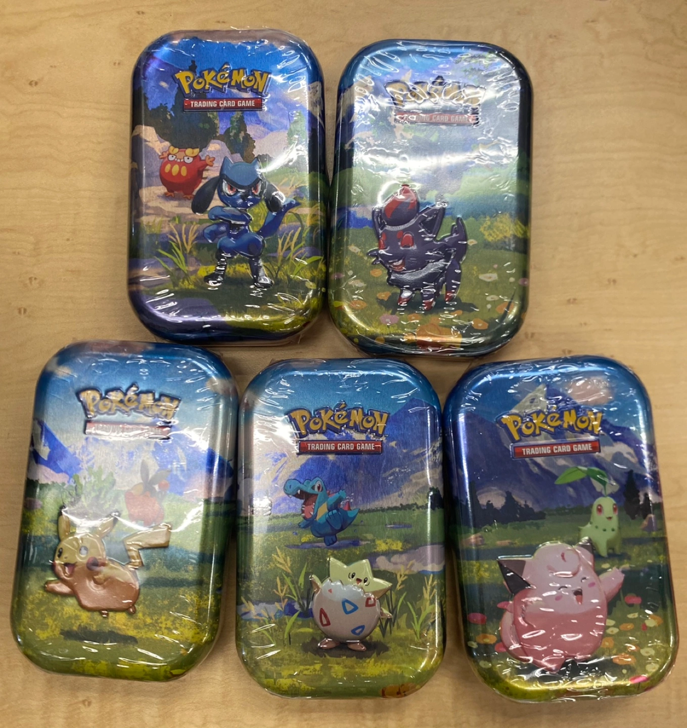 This is a set of five Ascended hero’s Pokemon Trading Card Game tins. Each tin features different Pokemon characters and artwork