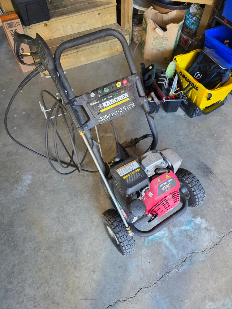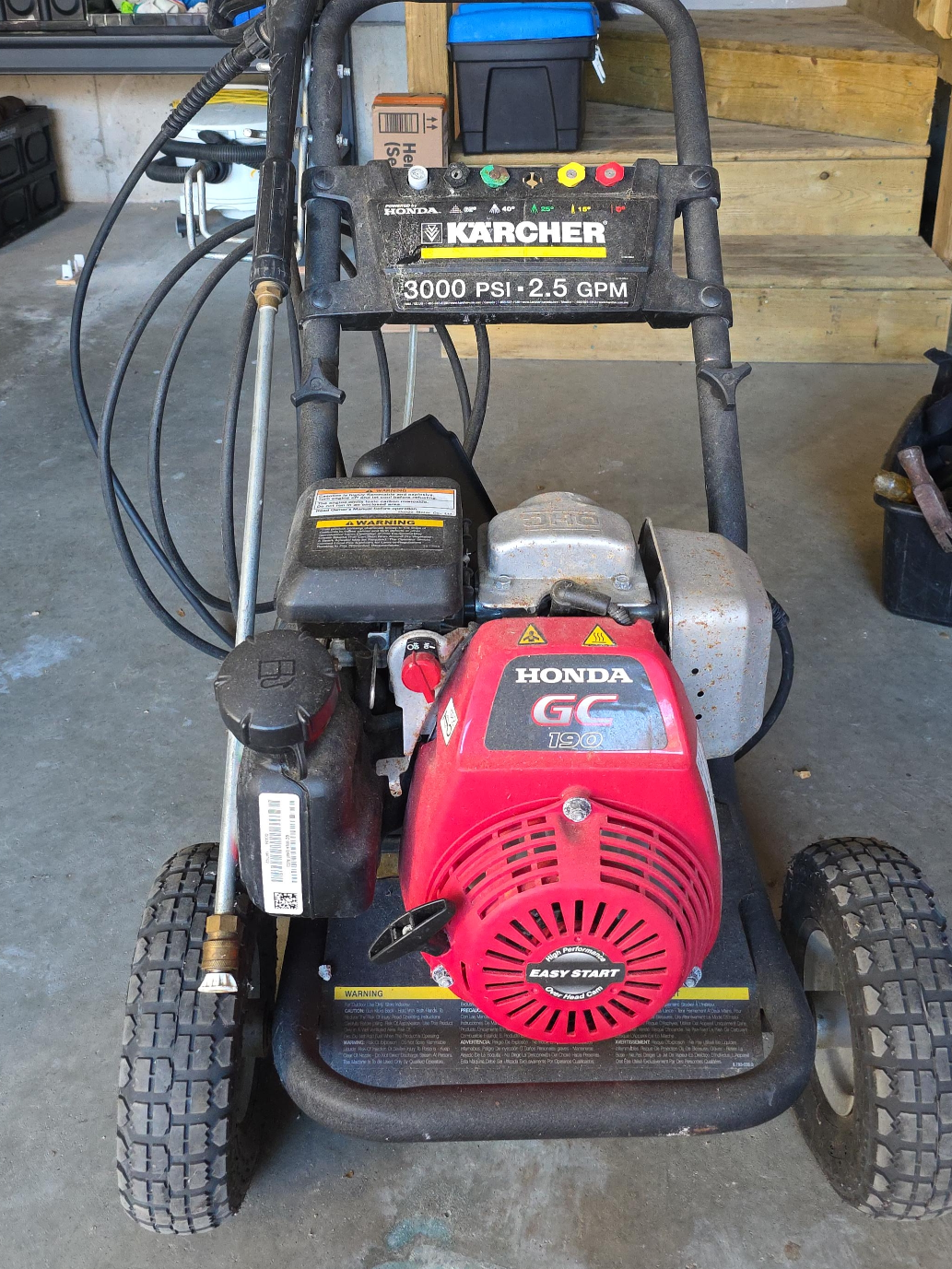 Selling a Karcher pressure washer with a Honda GC190 engine. It delivers 3000 PSI at 2.5 GPM. Perfect for cleaning decks, driveways, and more! Runs great. Sorry, delivery not available Cash only. EFT not accepted.
