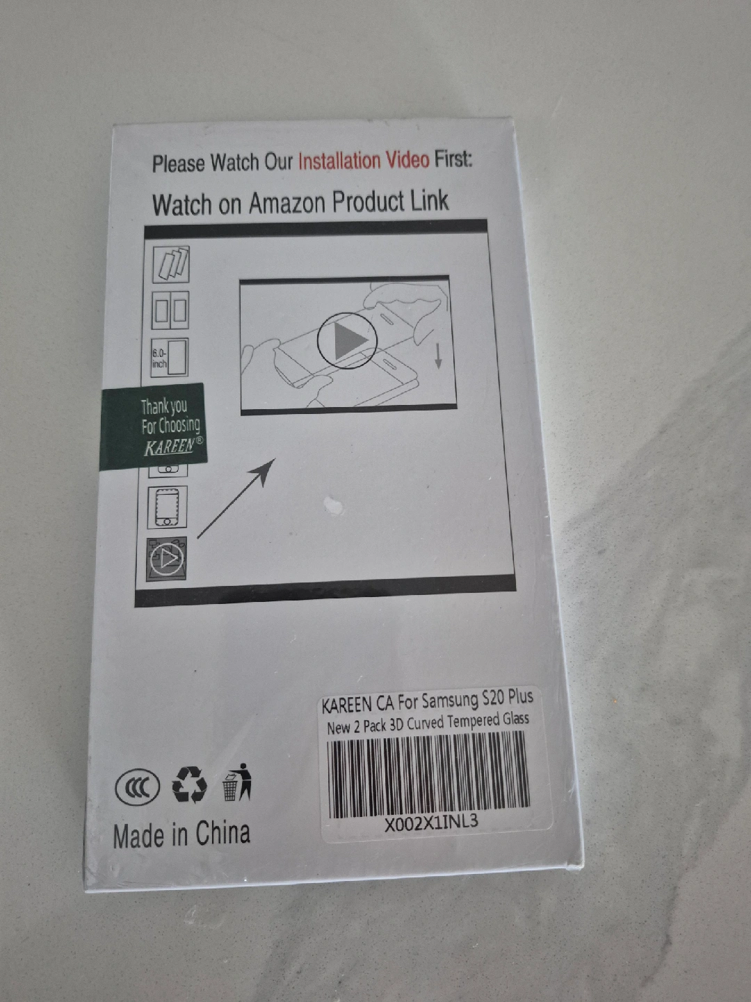 Selling a new 2-pack of Kareen CA 3D curved tempered glass screen protectors for the Samsung S20 Plus. The packaging highlights 99.9% transparency, anti-fingerprint coating, smooth glass touch, and 2.5D rounded edges