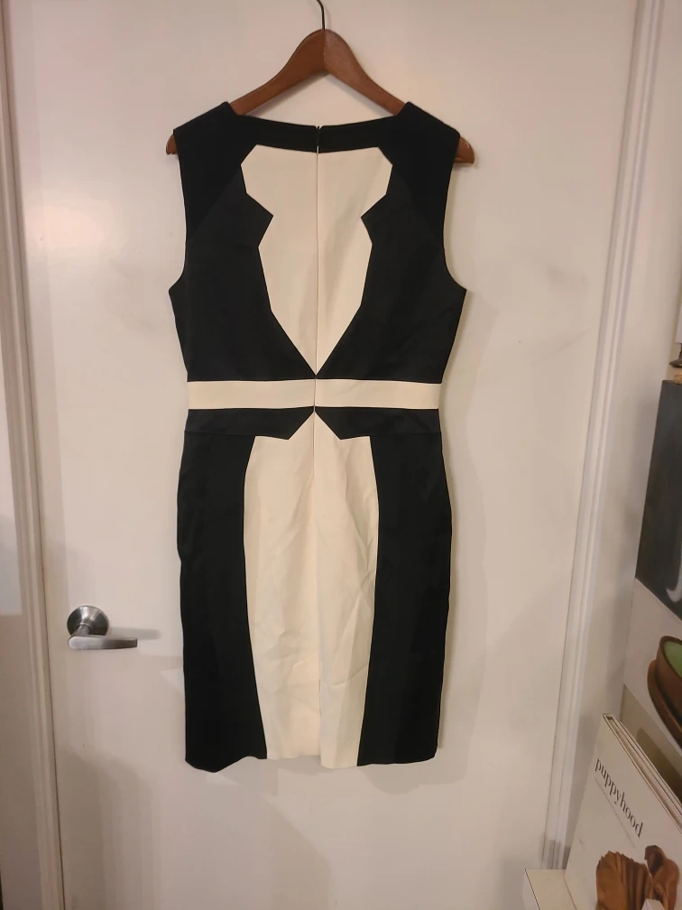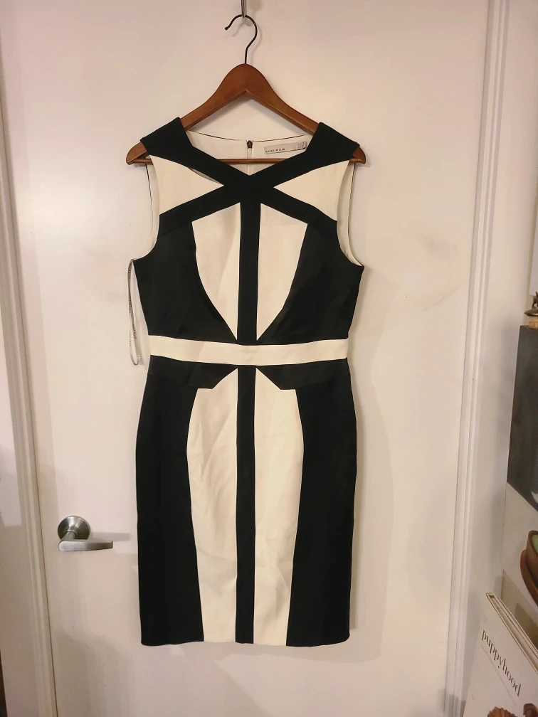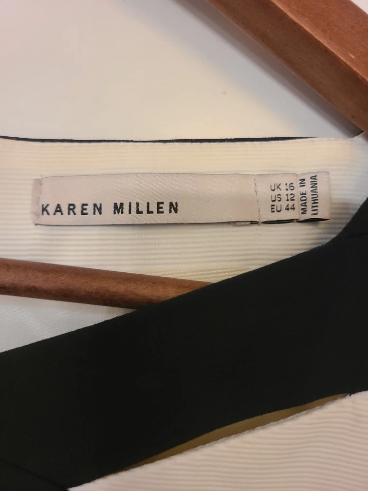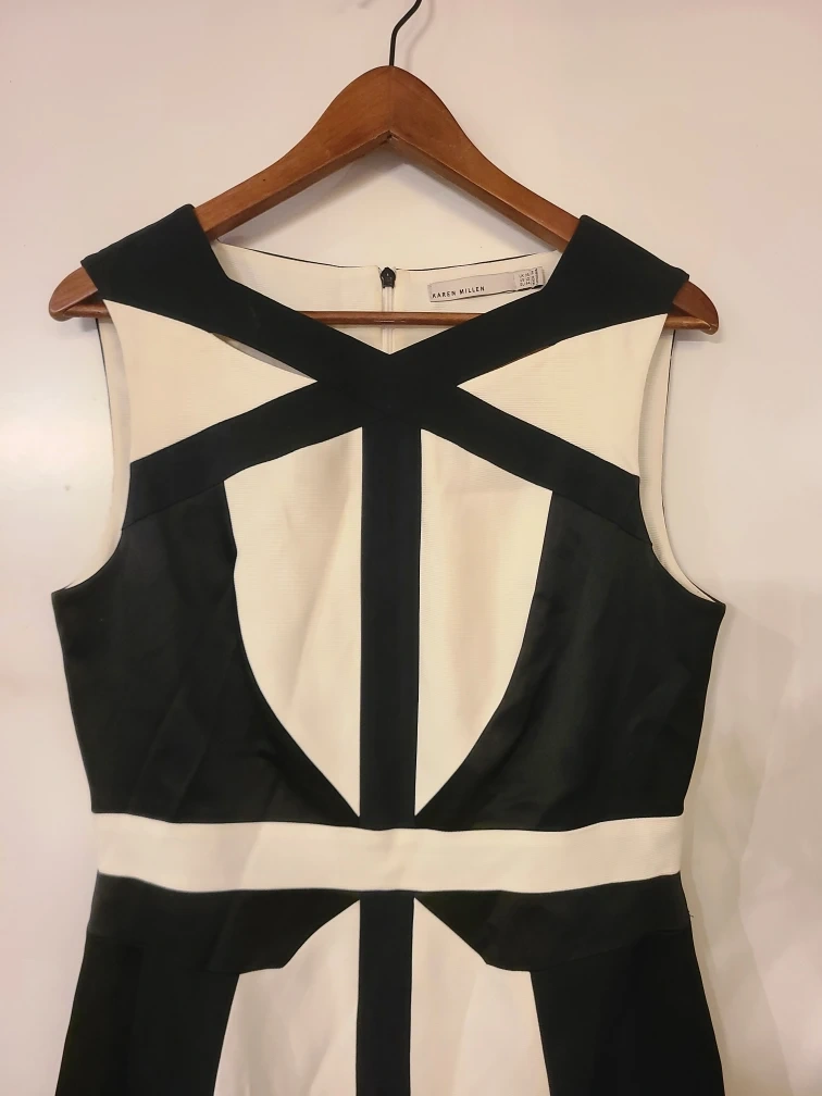 62Here's a stylish Karen Millen dress in a striking black and white design! It's a UK size 16, which is a US size 12. Perfect for a night out or a special occasion or to the office. Worn once.