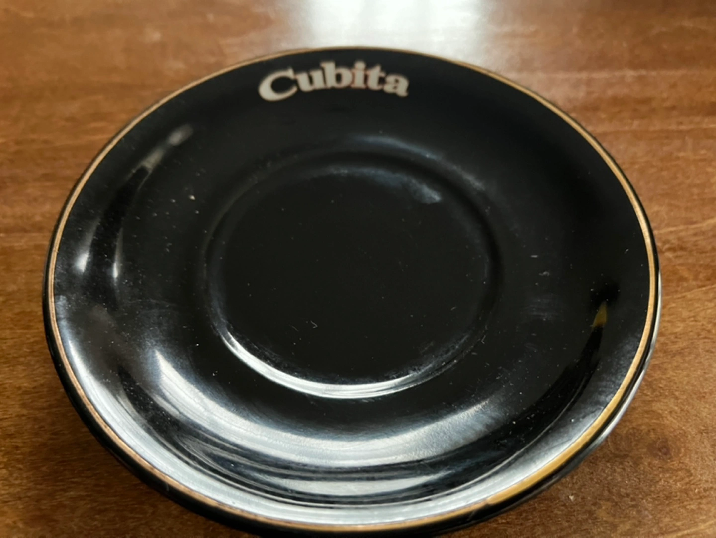 Black espresso cup and saucer set. Gold trim. Cubita branding on saucer. Cafe de Cuba branding inside cup.