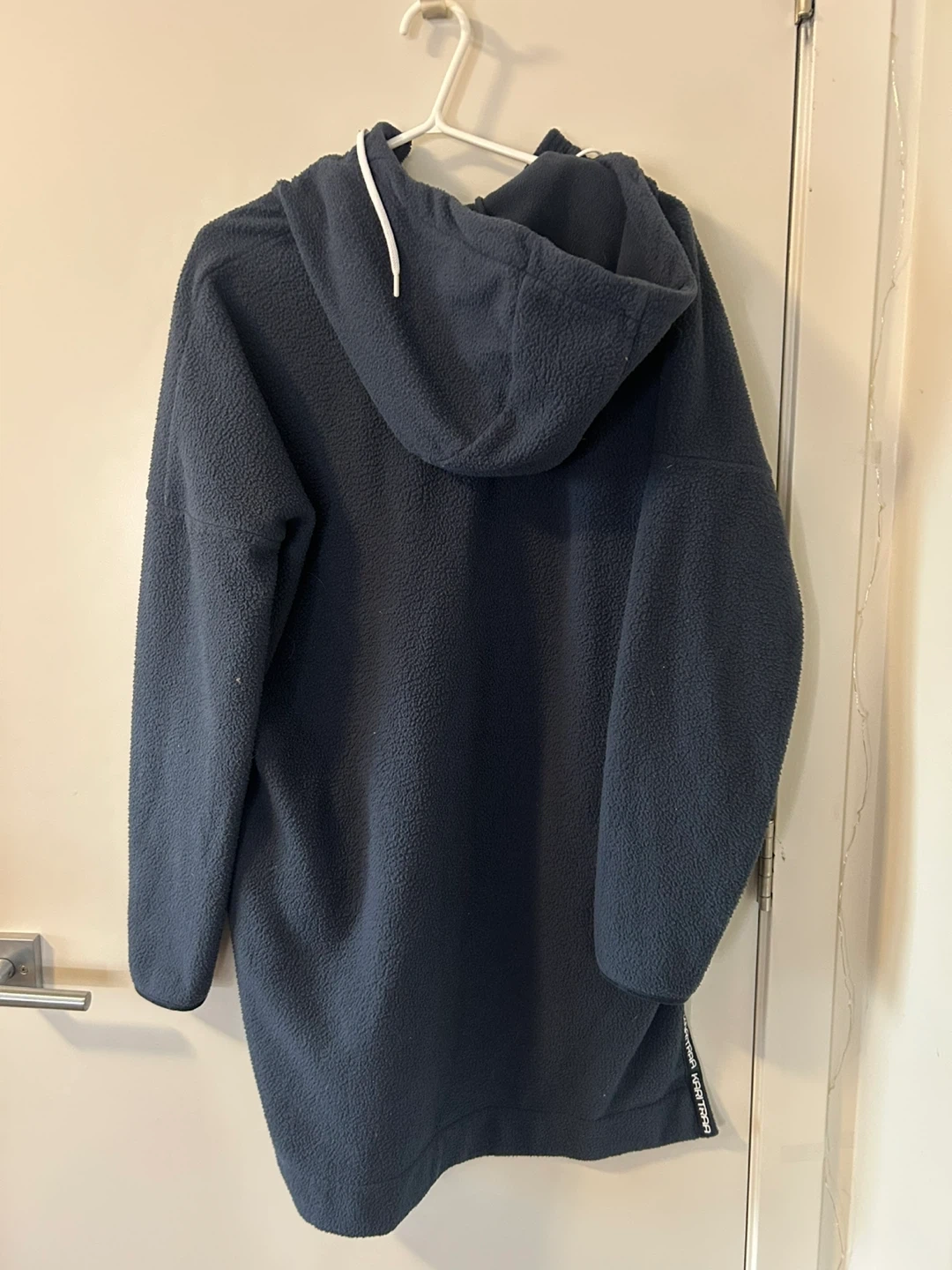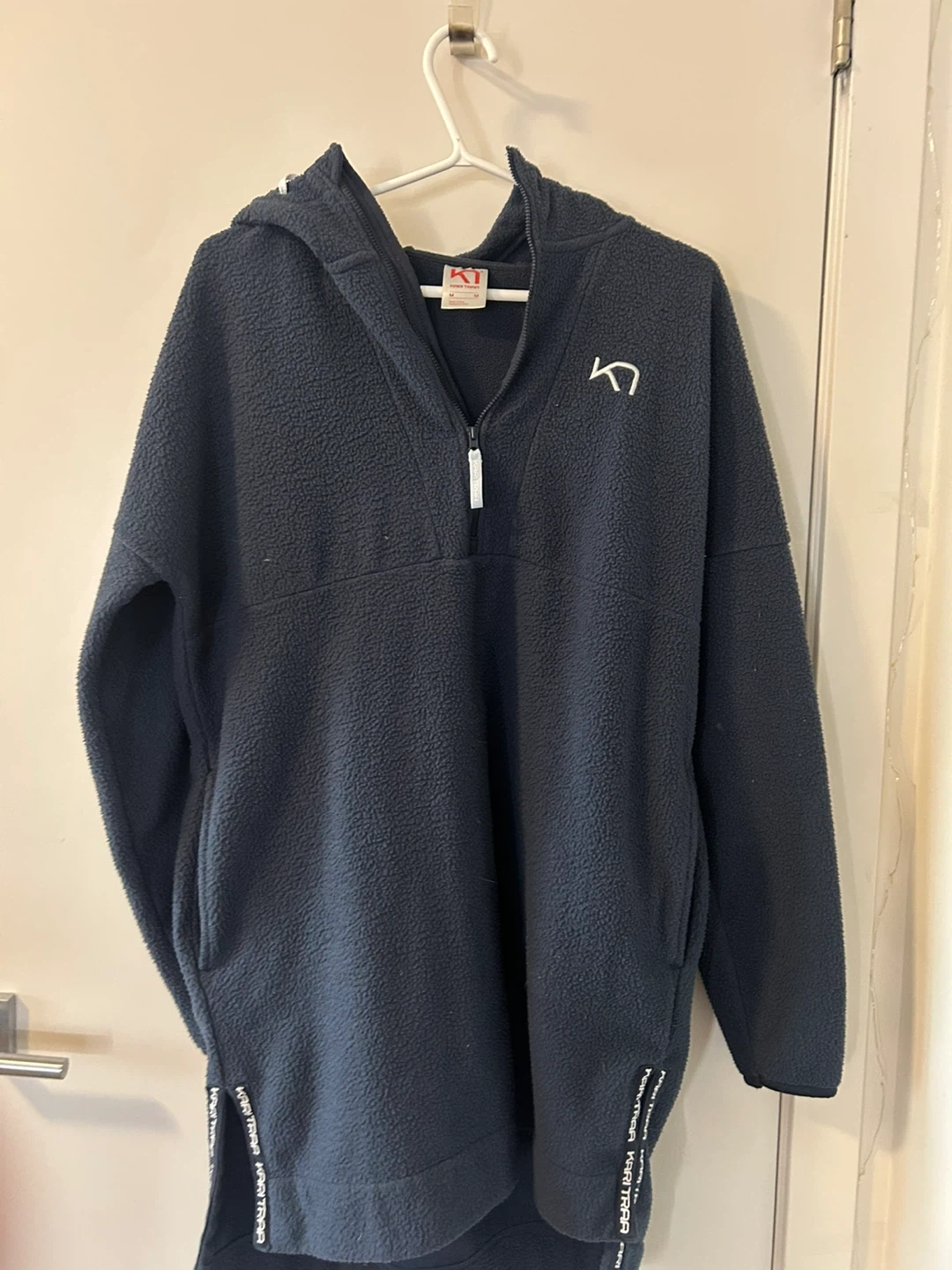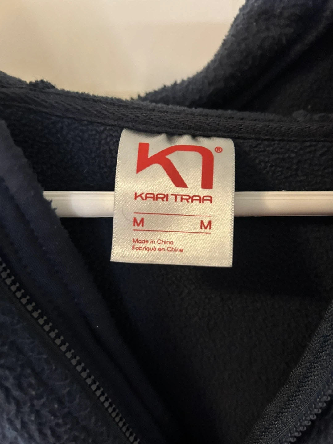 Cozy Kari Traa fleece hoodie in size medium! It's a nice navy blue colour and super comfy for lounging around the house or wearing out on a chilly day. The hoodie has a quarter-zip and a cool logo on the chest and down the sleeves