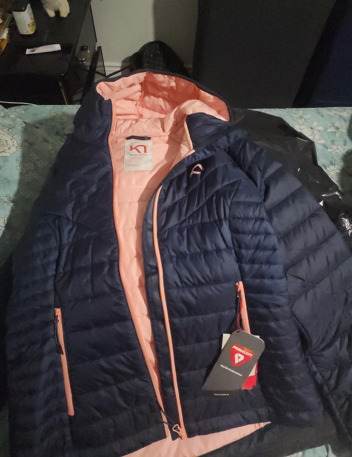 Cozy Kari Traa women's down jacket, perfect for staying warm! It's a size large and features a stylish navy blue exterior with a peach-coloured lining. The jacket also has PrimaLoft insulation for added performance.