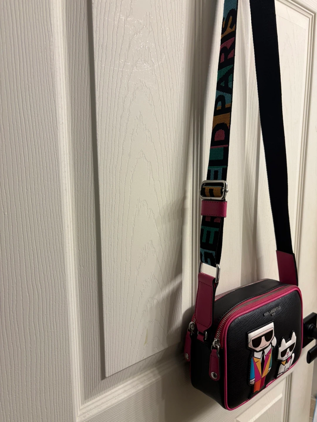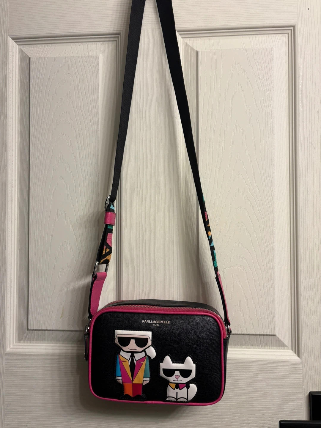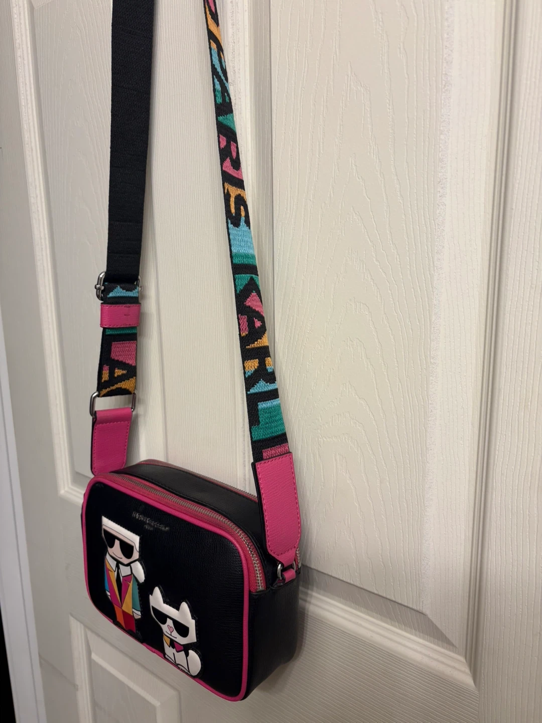 Super cute Karl Lagerfeld Paris crossbody bag! It features a black exterior with a fun design of Karl and his cat. The strap has the Karl Lagerfeld name on it in colourful letters. Perfect for adding a bit of fun to your outfit! Perfect condition! Pick up in Chestermere.